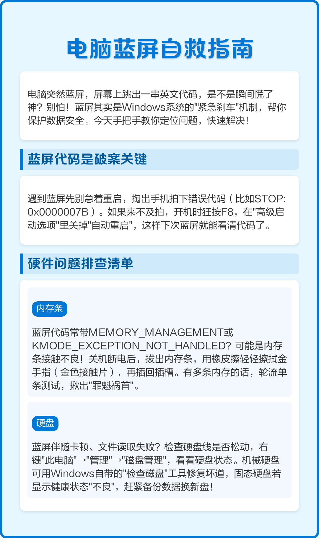 电脑开机蓝屏问题可通过以下方法逐步排查和解决1 排查外部硬件干扰拔下所有非必要外接设备如USB驱动器打印机外置硬盘等,仅保留键盘鼠标和显示器连接线,然后重新启动计算机部分外部硬件可能与系统启动冲突,导致蓝屏错误若重启后正常进入系统,可逐个重新连接外设,定位具体故障设备2。