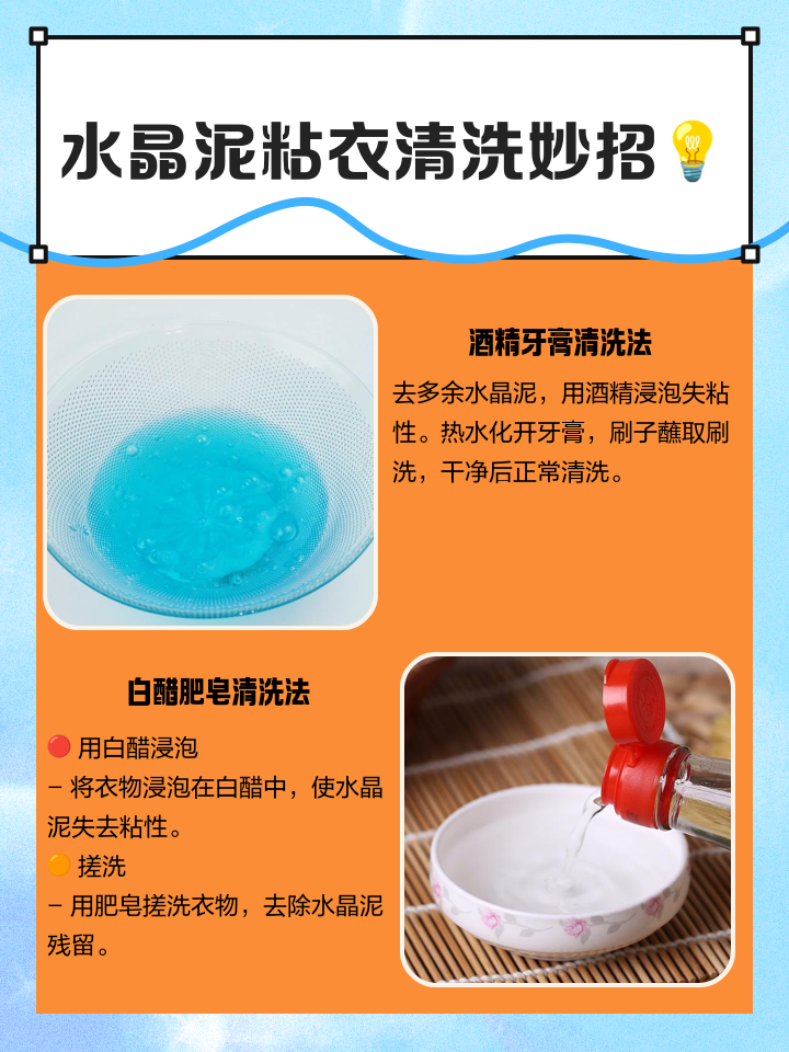 使用酒精首先,小心翼翼地把表面多余的水晶泥抠掉然后,拿出医用酒精,倒一点在粘了水晶泥的地方,让它完全覆盖住这样可以使水晶泥的黏性瞬间消失使用牙膏在酒精去掉黏性之后,用热水把牙膏化开,变成稠稠的牙膏水接着,用刷子蘸上牙膏水,轻轻地刷洗,这样可以去除衣物上残留的水晶泥痕迹;清洗掉衣服上的水晶泥,可以采用以下方法初步淡化污渍立即用清水冲洗发现衣服沾染水晶泥后,应立即用清水冲洗污渍处,并拧干衣物,尽可能使污渍淡化使用手洗专用洗衣液涂抹并静置在衣服干燥的情况下,将手洗专用洗衣液原液涂抹在污渍处,确保完全覆盖污渍静置5分钟后,再加入洗衣液进行常规;衣服粘上水晶泥的清洗方法有以下几种一热水冲洗法 步骤首先,将粘有水晶泥的衣服部分用热水冲洗热水的温度可以使水晶泥逐渐软化,从而更容易从衣物上分离注意事项确保热水的温度不会损坏衣物材质,同时冲洗时要均匀,避免局部过热二白酒涂抹法 步骤准备一根棉签,蘸取适量白酒,然后直接;浸泡清洗准备一盆温水,将少量的高锰酸钾或者醋溶入温水中,再将沾有水晶泥污渍的衣服放进去浸泡20分钟左右高锰酸钾不仅能够去除脏污,还能够有效抑菌,预防感染醋可作天然杀菌剂,能漂白衣物,去除脏污,还能够有效杀菌浸泡后用手搓洗干净即可按照上述方法操作,可以有效去除衣物上的水晶泥污渍;1 使用白醋清洗首先,将水晶泥凝结成块并尽可能地用手去除然后在泥污处滴上白醋,静置5分钟之后,用手或适合材质的刷子轻柔地刷洗,确保不损伤衣物这样简单的方法能够有效清除衣物上的泥污残留2 利用酒精清洗在水晶泥污渍下方放置一块干毛巾,用棉签蘸取酒精涂抹在污渍上,直到清洁剂。