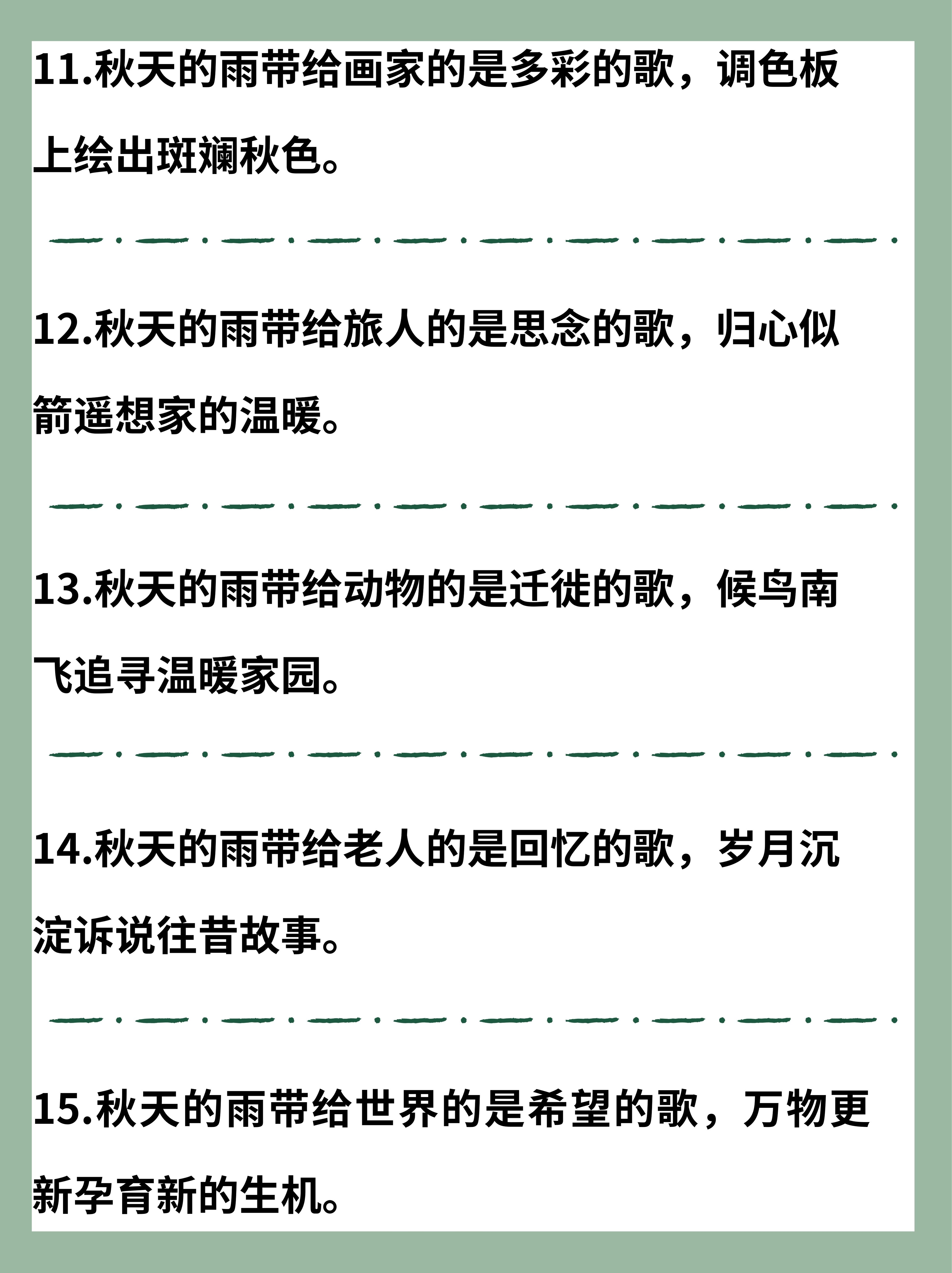 9、秋色宜人写一句话国庆节期间,天高气爽,秋色宜人,公园里游人如织层林尽染一丛金黄一丛火红秋意深浓秋色宜人秋兰飘香秋雨绵绵秋菊傲骨秋色迷人秋色宜人金桂飘香开车行驶在秋色宜人的盘山路上秋季,是“春夏秋冬”四季之一在我国,传统上是以二十四节气的“立秋”作为秋季的起点进入秋季。
