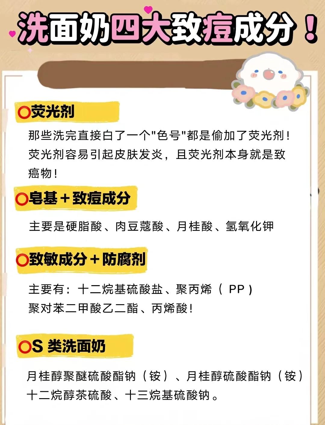 脂肪酸与碱剂结合形成的皂基成分示例月桂酸钠硬脂酸钠等不良影响长期使用会洗去皮肤大量水分,导致皮肤干燥此外,皂基还可能造成皮肤屏障受损,引发提早老化红血丝敏感等问题对于干皮和敏感皮来说尤其不推荐,油厚皮可在必要时偶尔使用DMDM乙内酰脲不良影响作为防腐剂存在于某些洗面奶中,会释放甲醛甲醛是一级。