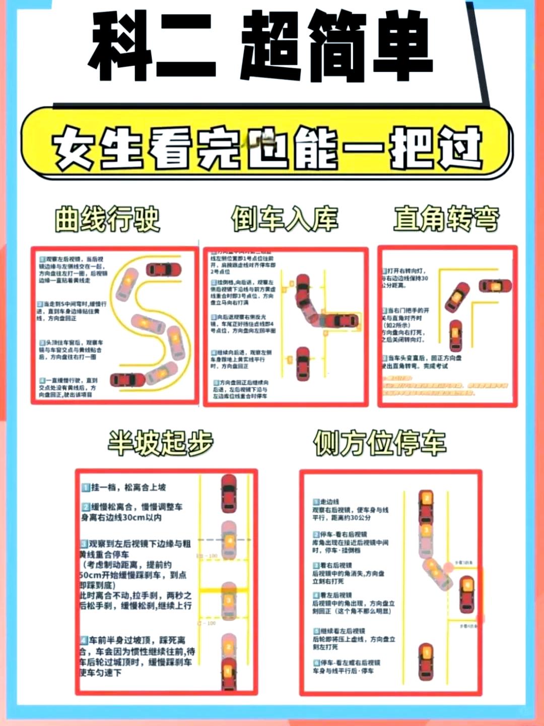 5、科目二必过技巧如下1侧方停车 侧方停车并不是五个项目中最难的,基本上练个几遍就没什么大问题了最重要的是在什么时候对哪个点往什么方向打方向盘,以及打多少的问题考试的时候,侧方位停车每个区域都会有摄像头,那么车头方向的摄像头是你要对的第一个点,此时先打右转向灯,看右侧窗户,在。
