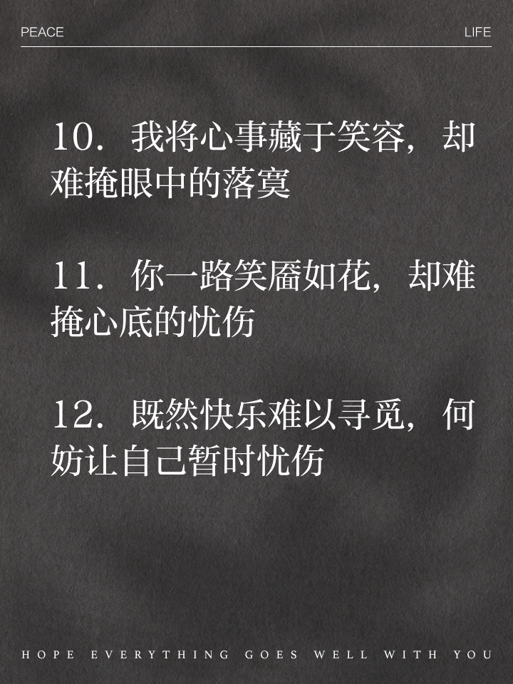 4、以下是一些适合发朋友圈表达不开心情绪的句子,以markdown格式输出,并加粗了重点内容1 后来我们都很干脆,你没有回头,我没有挽留从此成为陌路,音信全无 这句话表达了对过去关系的无奈和失落,适合在心情低落时发表2 离开你我一点都不好过,好想回到过去 直接表达了离开某人后的;以下是一些适合发朋友圈表达不开心情绪的句子,以markdown格式输出1 表达内心伤痛 真心的微笑,越来越少心中的伤痛,越来越多2 抒发孤独感 原谅我镇定自若百毒不侵,只因我身后空无一人3 感叹幸福缺失 因为你总会提醒就算我得到世界,有些幸福不是我的4 抒发无法自拔的情感 可能是我还。