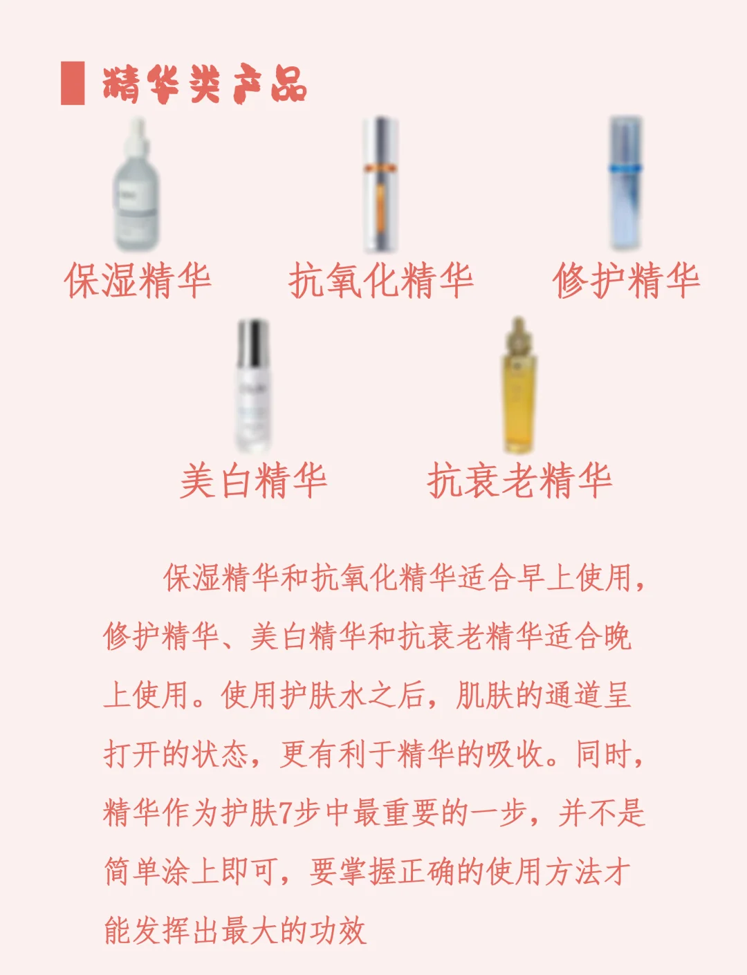8、下面一起来看看1正确的使用方法美白精华液的使用方法美白精华液主要用于护肤程序中的第三层在日常清洁完皮肤之后,便抹上爽肤水,之后便用美白精华液,这样做的原因是爽肤水能够帮助皮肤吸收水分,之后能让美白精华液的吸收更好美白精华液一次的用量为多少美白精华液的用量并不是越多越好的。