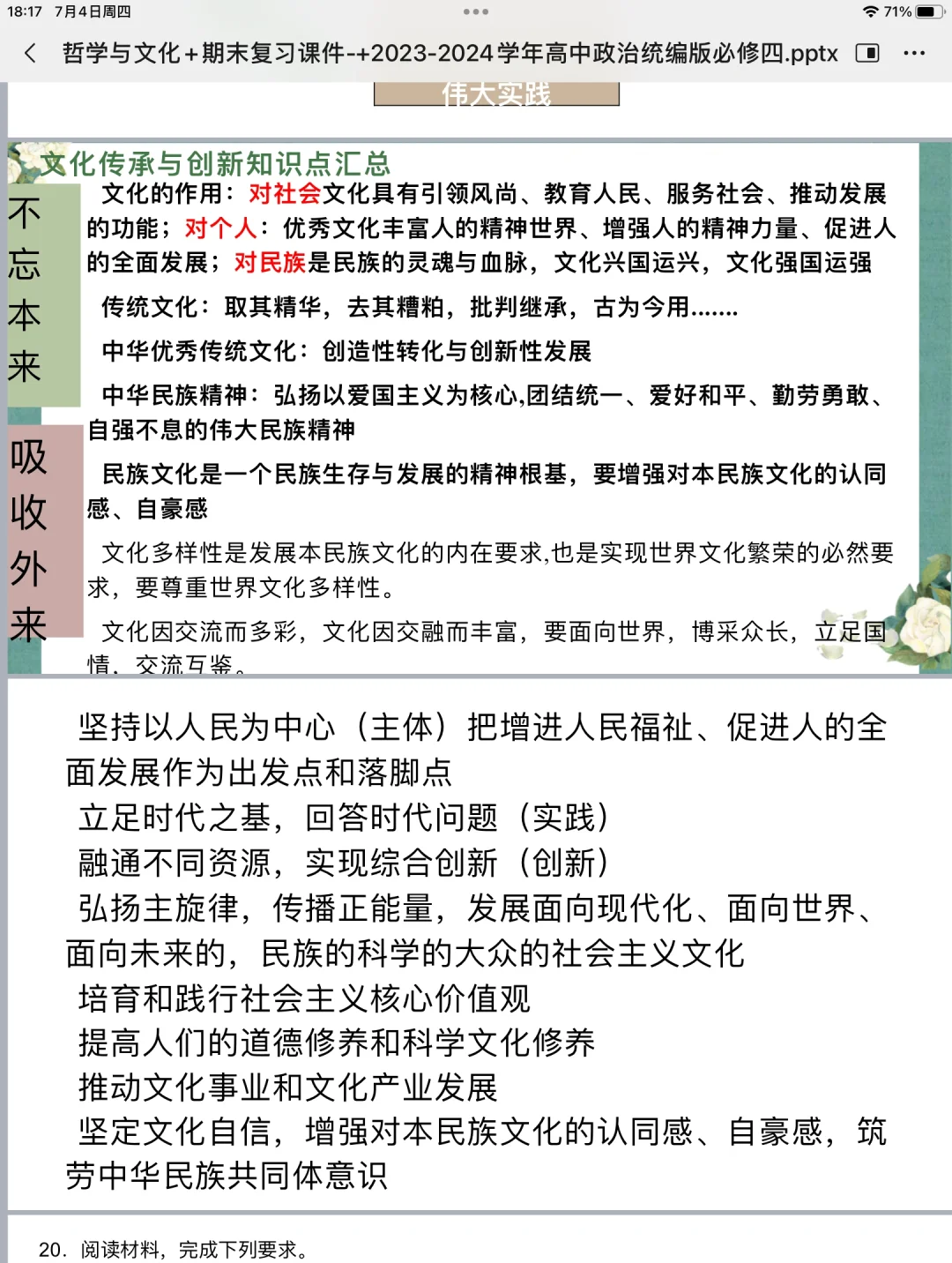 5、2 创新能够促进生产关系和社会制度的变革当技术和社会实践发生变化时,创新有助于调整和优化现有的社会结构,以适应新的发展需求3 创新是推动人类思维和文化发展的重要动力它不断扩展我们的认知边界,促进新思想的产生和交流,从而丰富我们的文化生活和哲学思考创新的意义在于创新是一个民族进步;三科技创新的社会意义 科技创新对于社会的意义深远它不仅可以解决当前面临的问题,还可以预见未来的挑战并提前做好准备科技创新在环境保护资源利用社会治理等方面发挥着重要作用,为我们构建一个更加和谐美好的社会提供了可能四总结 科技创新是推动社会进步的重要力量它不仅关乎经济和国家竞争;创新的意义在于它是民族进步的灵魂,国家兴旺发达的不竭动力,也是个人企业乃至国家在国际竞争中取得优势的关键具体来说民族与国家层面创新是中华民族最深沉的民族禀赋,在激烈的国际竞争中,只有不断创新,民族和国家才能立于不败之地,实现持续的进步和繁荣创新的作用主要体现在以下几个方面推。