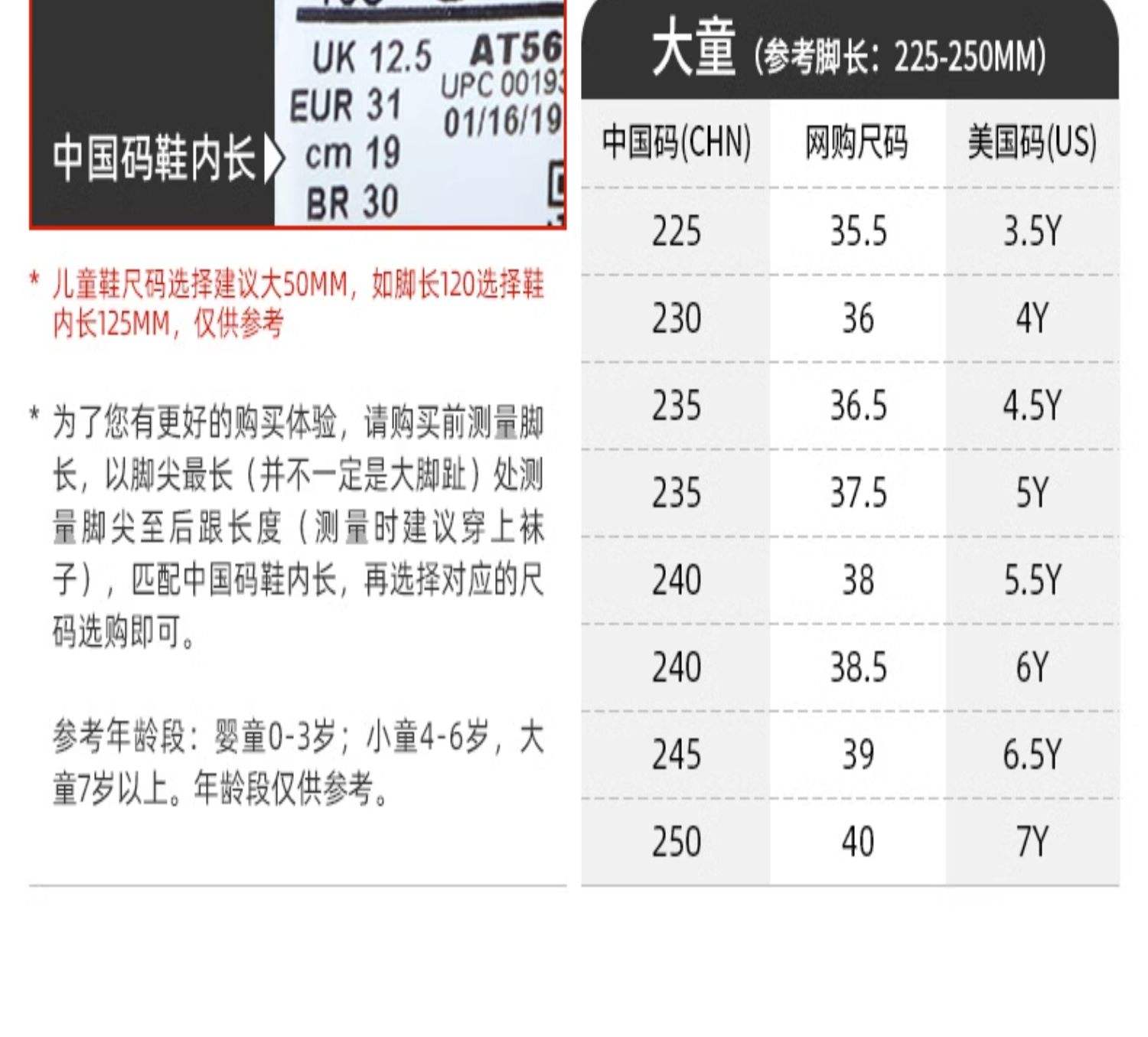 耐克儿童鞋子尺码对照表详述了美码英码CM尺码欧码等不同度量标准下的尺码对应关系根据耐克官方网站提供的信息,儿童鞋款的尺码对照如下 美码 1C 对应英码 05,CM尺码 7,欧码 16 美码 2C 对应英码 1,CM尺码 8,欧码 17 美码 3C 对应英码 15,CM尺码 9,欧码 18;在寻找适合您的耐克鞋时,了解其与国内尺码的对应关系至关重要以下是耐克鞋码的一般对照表,帮助您轻松找到合适的鞋码1 美国尺码耐克的美国尺码通常与国内尺码有细微差别对于男鞋,一般而言,美国尺码比国内大05至15码例如,如果您在国内是42码,可能在耐克需要选择415或425码2;耐克鞋码205是31码耐克鞋码对照表是分为nike男鞋对照表和NIke女鞋对照表的其中耐克男鞋对照表是从24cm31cm的,分别对应欧洲码388475,耐克女鞋对照表是从22cm305cm,分别对应欧码3546当然也如果是情侣鞋的话,那么这两表就可以合并取交集了也有童鞋喜欢通过英国码或者美国码要辨认,其实都是可以;425码为欧码,根据nike男子鞋款尺码对照表425码对应脚长262CM,女子鞋款尺码对照表上262CM为42欧码一男子鞋款尺码对照表123二女子鞋款尺码对照表 12根据nike尺码对照表显示对比男款及女款鞋码男款女款脚长一样,对应的CM尺码欧码英码美码是不一致的根据自;一种脚的码数实际鞋码偏大或偏小,需试穿后确定具体数值可能因鞋型设计差异而有所不同根据版型大小宽度选择合适码数具体的数值可以查阅最新的耐克官方网站发布的尺码表耐克鞋码对照表的解释如下耐克鞋码对照表可以帮助消费者确定适合自己的鞋码在购买耐克鞋时,可以参考脚长和对应的尺码范围。