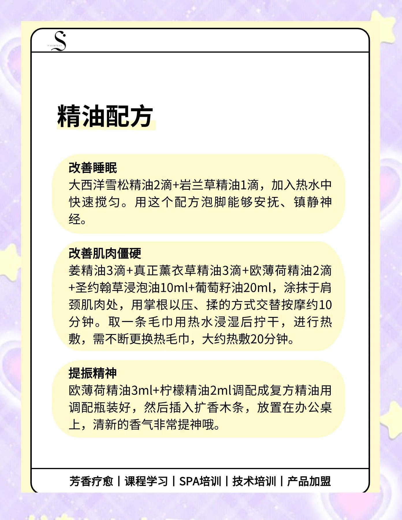 迷迭香2滴+丝柏3滴+天竺葵3滴+15ml基础油治疗便秘瘦小腹配方 马郁兰2滴+迷迭香1滴+甜橙2滴+薄荷2滴+葡萄籽油15ml经期孕期禁用治疗便秘配方 马郁兰3滴+甜橙2滴+10ml基础油,顺时针按摩腹部缓解肌肉疼痛配方 配方1马郁兰2滴+雪松2滴+薰衣草或罗马洋甘菊1滴配方2葡萄籽油或甜杏仁油10ml。