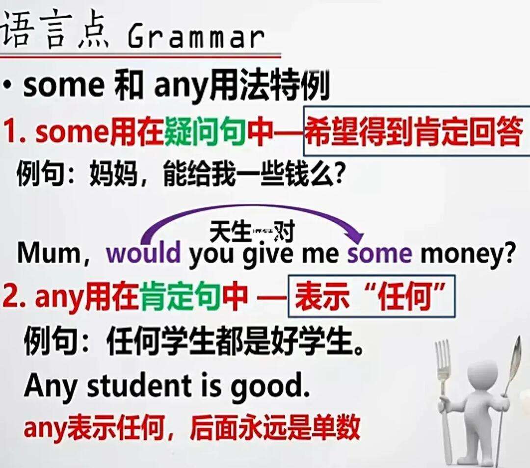 1any some的意思都是一些 后可以+可数名词复数也可加不可数名词区别是some用在肯定句中 any用在否定句和疑问句中2some有时候也可用在疑问句中 如果是邀请并希望得到对方肯定回答是用some 这种用法多出现在would like句型中 如Would you like some apples?3some和any作为形容词。