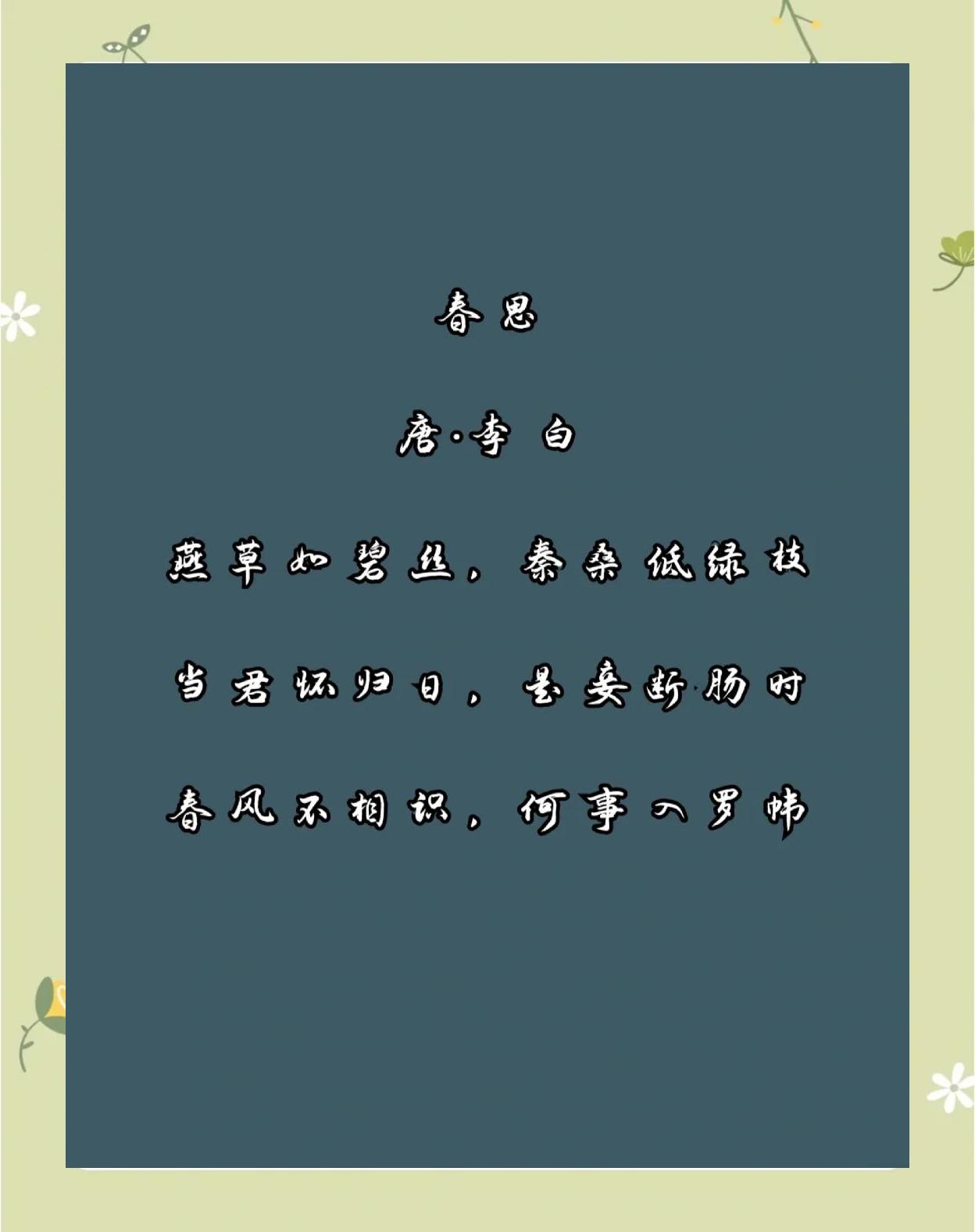 2、这种自然意象的对比,既点明了季节特征,又为后文的情感抒发埋下伏笔诗中女子因春景触情,思念远在边塞的丈夫,而“当君怀归日,是妾断肠时”一句,更以时空错位的心理描写,深化了相思之苦 二情感表达的双重维度 李白的春思并非单纯描写男女之情,而是通过个人情感折射出普遍的人生困境;据我感觉,你的两句诗有些毛病,应当是燕草如碧丝,秦桑低绿枝李白春思赏析 李白 燕草如碧丝,秦桑低绿枝当君怀归日,是妾断肠时春风不相识,何事入罗帏燕地的春草刚刚发芽,细嫩得像丝一样,秦地的桑树已经低垂着浓绿的树枝当你心里想着归家的日子,正是我思念你断肠的时候春风;燕草如碧丝秦桑低绿枝出自哪首古诗,燕草如碧丝原文很多朋友还不知道,现在让我们一起看看吧1春思作者李白 朝代唐 燕草如碧丝,秦桑低绿枝当君怀归日,是妾断肠时春风不相识,何事入罗帏2译文 燕地小草像碧丝般青绿,秦地的桑树已叶翠枝绿当你怀念家园盼归之日,早;这首诗以清新自然的语言优美流畅的意境,表达了深沉的情感,同时又兼具艺术美感和思想深度李白的春思开篇即以“燕草如碧丝,秦桑低绿枝”勾勒出一幅生机盎然的春日景象北方的燕地春草刚刚萌发,如同细密柔软的丝线而南方的秦地桑树早已枝繁叶茂,绿意盎然“燕”与“秦”分别暗示了两地的。