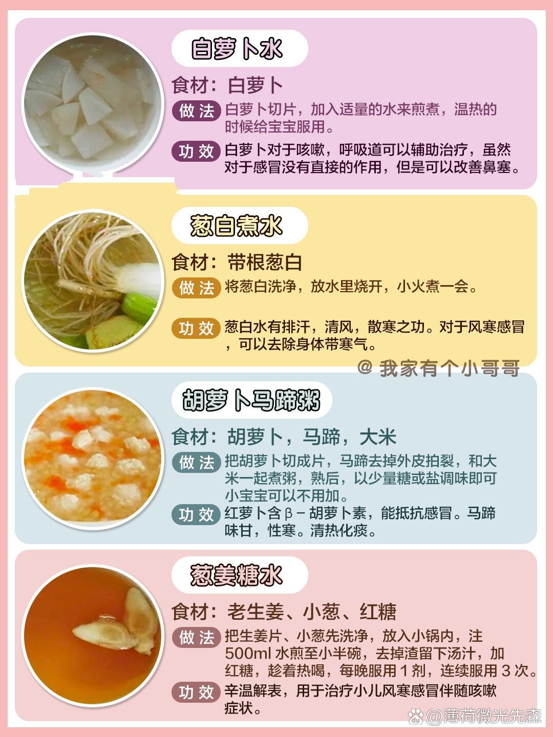 13、20个月宝宝感冒的食谱推荐如下对于风寒引起的感冒 萝卜葱白汤白萝卜可以缓解宝宝的咳嗽,葱白具有杀菌作用,有助于感冒的恢复 红糖姜汤姜片可以驱走体内的寒气,红糖则能补充能量,适合宝宝早晚食用 蜂蜜萝卜汤蜂蜜有化痰的功效,与白萝卜搭配,对缓解咳嗽有良好效果 贝母梨子汤贝母和梨子。