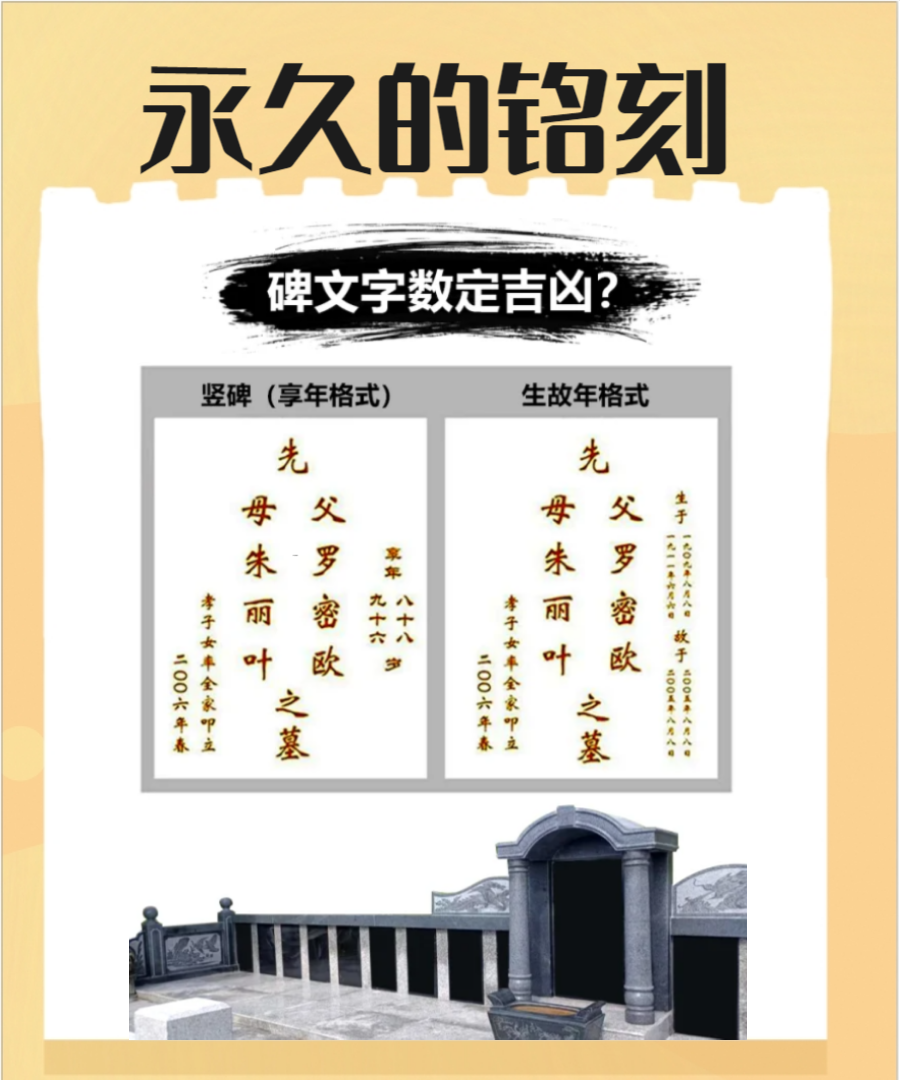 墓碑与墓穴之间的距离应适中,不宜太远也不宜太近,一般建议在穴位的9寸到6尺之间为宜墓碑的碑文内容石碑上通常刻有墓主人的名讳立碑人的名字以及立碑日期等碑刻应为阴刻,而非凸刻格式抬头可写死者的生前职务职业等,也可省略正文主要写明立碑者对死者的称谓及死者的姓名。