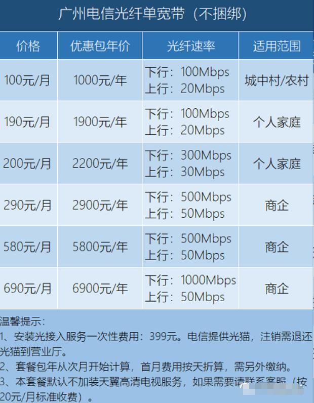 109元月包含汕头电信100M宽带及光猫需支付100元安装费,光猫为借用,需新开卡139元月升级至300M宽带+光猫安装费100元,光猫借用,新开卡适用179元月提供1000M宽带+家庭摄像头+路由器+烟感设备安装费200元,光猫借用,仅限新开卡109元包月100M光纤+红米手机安;500M宽带6个月费用360元,包年600元,包2年1080元,包3年1440元,适合家庭多设备同时连接1000M宽带高速套餐中,6个月费用480元,包年840元,包2年1560元,包3年2160元,满足高清视频游戏等高带宽需求二潍坊广电宽带套餐资费广电宽带在安丘市以“宽带+设备”捆绑形式提供服务300M宽带;中国电信全光WiFi千兆的月租费用根据套餐类型有所不同,单宽带套餐的月租费用在139290元之间,融合套餐的月租费用最低为199元月以下是具体的费用说明一单宽带套餐费用 中国电信提供的单宽带套餐中,全光WiFi千兆的月租费用有一定的浮动范围,具体在139290元之间这一费用仅包含宽带服务,不包含;费用原价为199元月,但首年可享受优惠价995元月内容该套餐主要提供1000M的宽带服务,适合对网速有极高要求的家庭或企业用户旗舰版融合套餐费用199元月内容除了包含1000M的宽带服务外,还额外提供了60G的流量和700分钟的通话时长这种套餐更适合需要同时满足宽带通话和流量需求的。