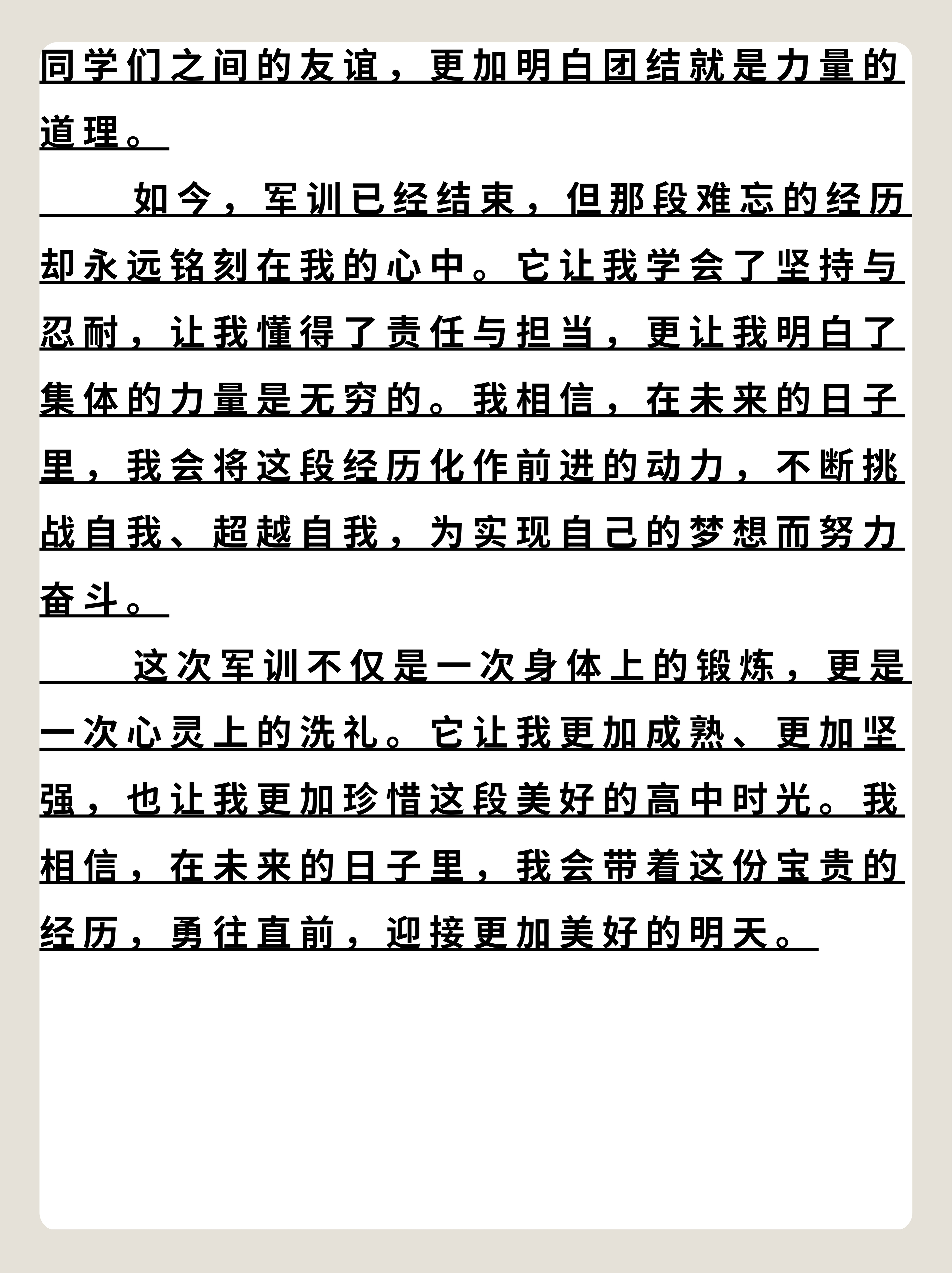 真的!总觉得以上的文学并不是什么军训感言,我倒是更愿意视之为一篇日记,军训还有十天,只是每日想法不同,现在写的只代表前一刻,而下秒将如何发展,如何被想,就是另一回事了更多的事在等我呢!更多的想法也正在蓄势待发吧!写在明天以前的感言,代表思想日渐成熟,代表明天会更好。