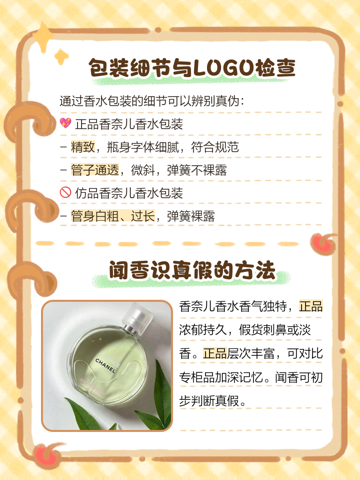 香奈儿香水是全球知名的奢侈品牌之一,因其独特的香味和优雅的包装受到许多消费者的喜爱然而,市场上也存在一些假冒伪劣的产品,给消费者带来了不少困扰为了确保购买到正品香奈儿香水,以下是一些辨别真假的方法观察包装盒正品香奈儿香水的包装盒通常采用高质量的材料制成,表面光滑无划痕,字体清晰可;1香奈儿香水真假辨别1不管是正版标准装还是正版小样,在香水瓶底大都有一张透名塑料纸,上有这款香水的品名,规格和产地的介绍也有的是直接将产地刻印在瓶底假香水没有这张纸,也没有刻纹这是第一个可以用来辩别真假香水的方法2正版香水的瓶底和外包装盒底都有统一的编号,假如瓶底。