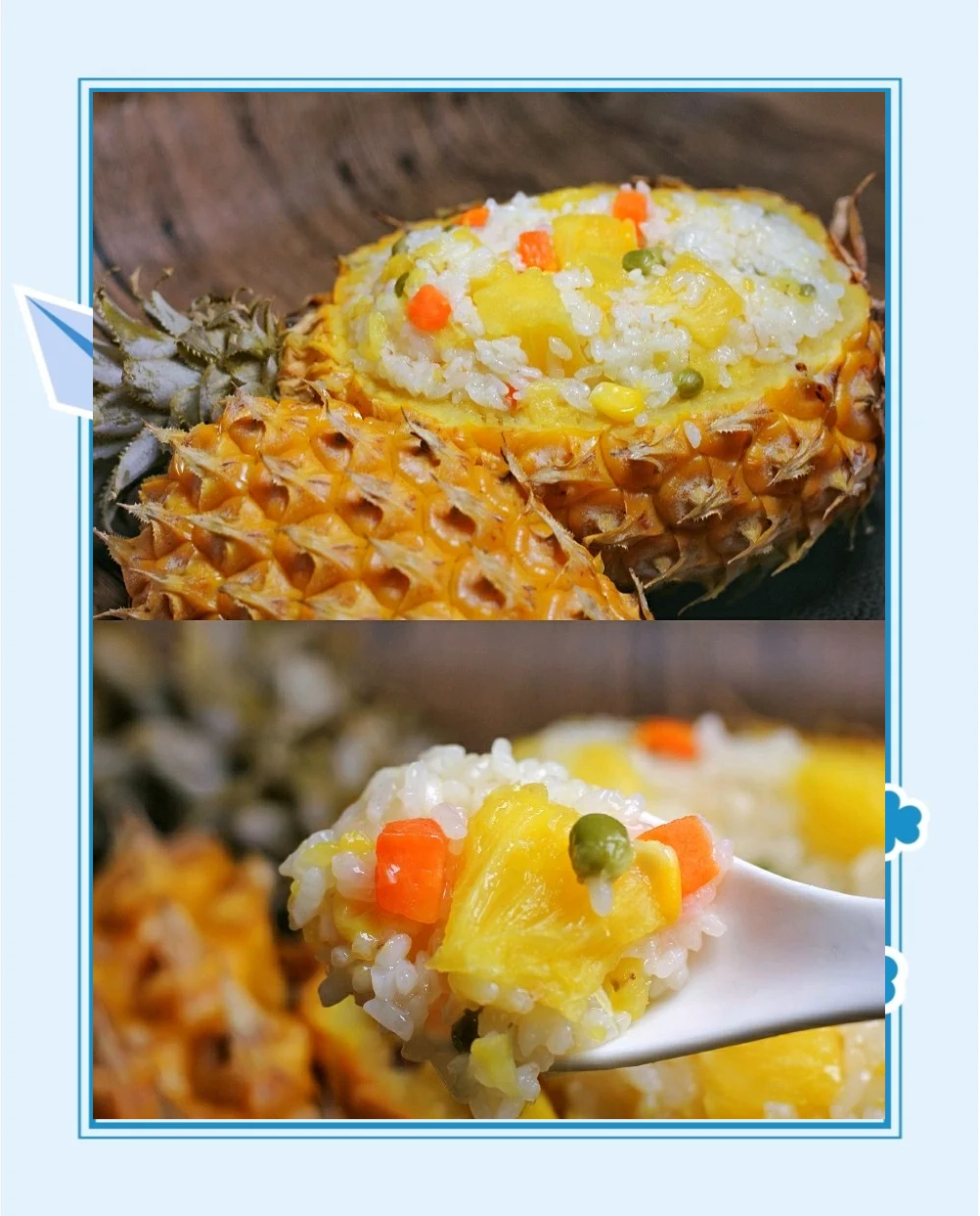 做法 1将新鲜菠萝切半,用小刀将其肉挖出,切成1CM大小的丁浸入盐水,保留12个菠萝壳做容器,青红椒切1CM大小的丁2锅中热油,待六成热时,磕入鸡蛋,抄成鸡蛋碎,盛出备用虾仁过开水汤熟3锅内留底油,待热后依次放入洋葱青红椒青豆玉米翻炒片刻后,加入香米饭,炒匀4往;6将炒好的菠萝饭盛入菠萝碗中,撒上熟腰果仁即可 注意事项 1香米应蒸得稍干一些,这样制成的炒饭才好吃2有过敏史的人最好不要吃菠萝中含有一种致敏物质菠萝朊酶,而盐水能破坏其致敏结构,所以菠萝切开后要在盐水中浸泡一下做法二 原料菠萝一个糯米配料枸杞子葡萄干;装入菠萝容器将炒好的菠萝饭盛入挖空的菠萝容器中,轻轻压实如果菠萝容器较大,而炒饭量不够,可以在旁边用一些小水果或蔬菜进行装饰,如樱桃番茄生菜叶等,使整个菜品看起来更加丰盛美观 搭配食用菠萝饭可以直接食用,也可以搭配一些泰式甜辣酱番茄酱或沙拉酱等蘸料一起食用,根据个人口味选择即可 三小贴士;最后放入两勺菠萝果肉喜欢菠萝味道的可多放,但需撇去菠萝汁,避免饭太湿装入菠萝将炒好的饭装入挖空的菠萝中可选步骤放入烤箱150度烤15分钟,让菠萝味道更好渗透到米饭中若无烤箱,可用蒸锅蒸15分钟但烤制口感更佳完成菠萝饭做好后,即可上桌享用米饭透着菠萝的果香味。