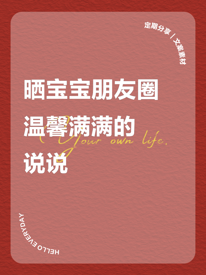3、1天线宝宝出来晒太阳咯2因为有了你的存在欢声笑语不断快乐幸福涌入3你是妈妈的巧克力乖巧刻骨又努力4你成长的道路千姿百态呆萌可爱调皮又搞怪5灿烂的季节迎接灿烂的你,这个世界因你而变化6对于人来说什么是幸福,我想就是看到自己的宝宝诞生你的到来就是我延续的生命,你的第;醒时确实小恶魔你的双面性格,让我既爱又“恨”,但更多的是宠溺家庭幸福大女儿像爸爸,小女儿像妈妈,儿子像爸爸,儿女双全,幸福的一家五口感谢上天赐予我们如此可爱的孩子们,让我们的家庭充满了欢声笑语这些说说既温馨又可爱,适合在朋友圈分享宝宝的成长点滴和家庭的幸福时光;4一画就着迷的孩子,作品终于完成5哇哦!真是个厉害的小画家呀!6今日份拍摄,记录着你们的点点滴滴 是一种种幸福,愿时光缓慢且温柔7十月份作品整理孩子笔下的小螃蟹8你的小手很灵巧,画画的非常漂亮9今日我家小画家作品一份10绘画在孩子们眼中就像缤纷的彩虹,孩子们可以用它编织七彩的;1宝宝周岁生日祝福语希望你身体强壮,快快长大,越长越可爱哦2求上帝在我儿子生日这天,我儿子想要什么,希望能为他实现,同时把我的祝福带到,祝福我儿子身体健健康康,生活快快乐乐!无忧愁,无烦恼3你那宽厚有力的肩膀为我依靠,从此我不再胆怯你用你坚强有力的臂膊将我紧紧环拥,从此我的世界变的温暖;1照片不能代替记忆却能保存记忆,成长的每一个瞬间都值得珍藏 2操碎我心的是你,萌化我心坎的也是你 3孩子,你的到来点亮了我们的生命,为我们的生活赋予了全新的意义4因为你的降临,这一天成了一个美丽的日子,从此世界也多了一抹诱人的色彩,而我生命的画屏上更添了许多美好的记忆。