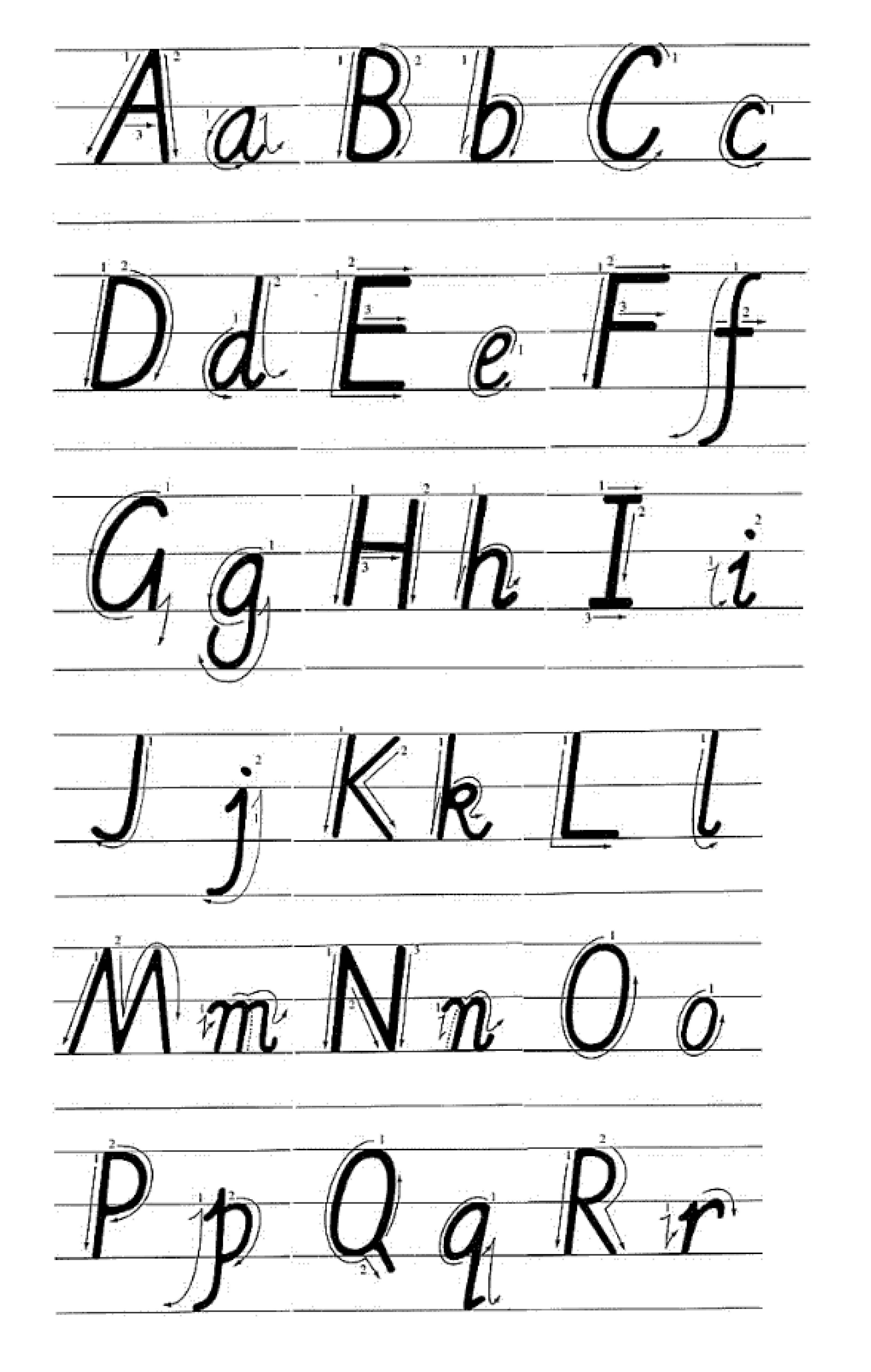 26个字母书写的规格 1每个字母都应稍向右倾斜,约为5°,斜度要一致2大写字母都应一样高,占上面两格,但不顶第一线3小写字母a,c,e,m,n,o,r,s,u,v,w,x,z写在中间的一格里,上下抵线,但都不出格4小写字母b,d,h,k,l的上端顶第一线,占上面两格5小写字母i和j的点f和t的。
