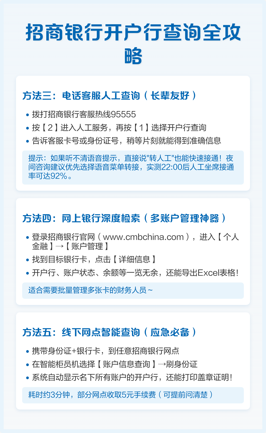 查询银行卡开户行和行号的方法1 通过网上银行查询2 使用银行官方APP查询3 拨打银行客服电话查询4 前往银行柜台查询详细解释1 通过网上银行查询如果持卡人已经开通了网上银行服务,可以登录银行网银,通过账户相关的查询功能,找到银行卡的开户行信息一般网上银行的服务指南或者账户管理;2登录大众版后,点击账户管理一卡通开户信息查询3登录手机银行,点击我的银行卡,选一下卡号就能查询开户行哦卡片没关联到手机银行的话,选“+其他银行卡”就能输卡号查,还支持扫码哦如是他人招行一卡通储蓄卡以下方法也适用于本人一卡通开户行查询1拨打客服热线,选择。