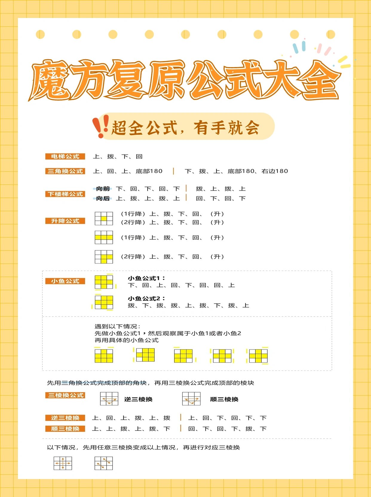 玩魔方是一项很有趣的活动,但对于初学者来说,可能会感到困惑和挫败为了让新手们更容易掌握魔方的技巧,有一些口诀和公式可以帮助他们快速学习口诀1 先转上面,再转下面,左右两边互换转2 下左右,上顺时针下右左,上逆时针3 拧对面,转顶面再拧一次,转底面4 面对自己。
