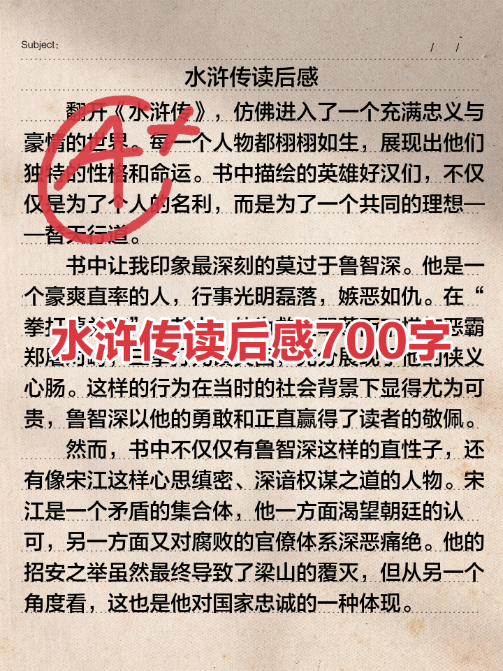 读水浒传有感侠义精神与人间温情的共鸣 利用寒假时光,我阅读了中国四大名著之一的水浒传,这部由元末明初文学家施耐庵创作的巨著,以宏大的历史叙事和鲜活的人物群像,展现了梁山好汉反抗压迫追求正义的壮丽史诗书中“官逼民反”的核心主题与“替天行道”的侠义精神,不仅让我感受到古代。