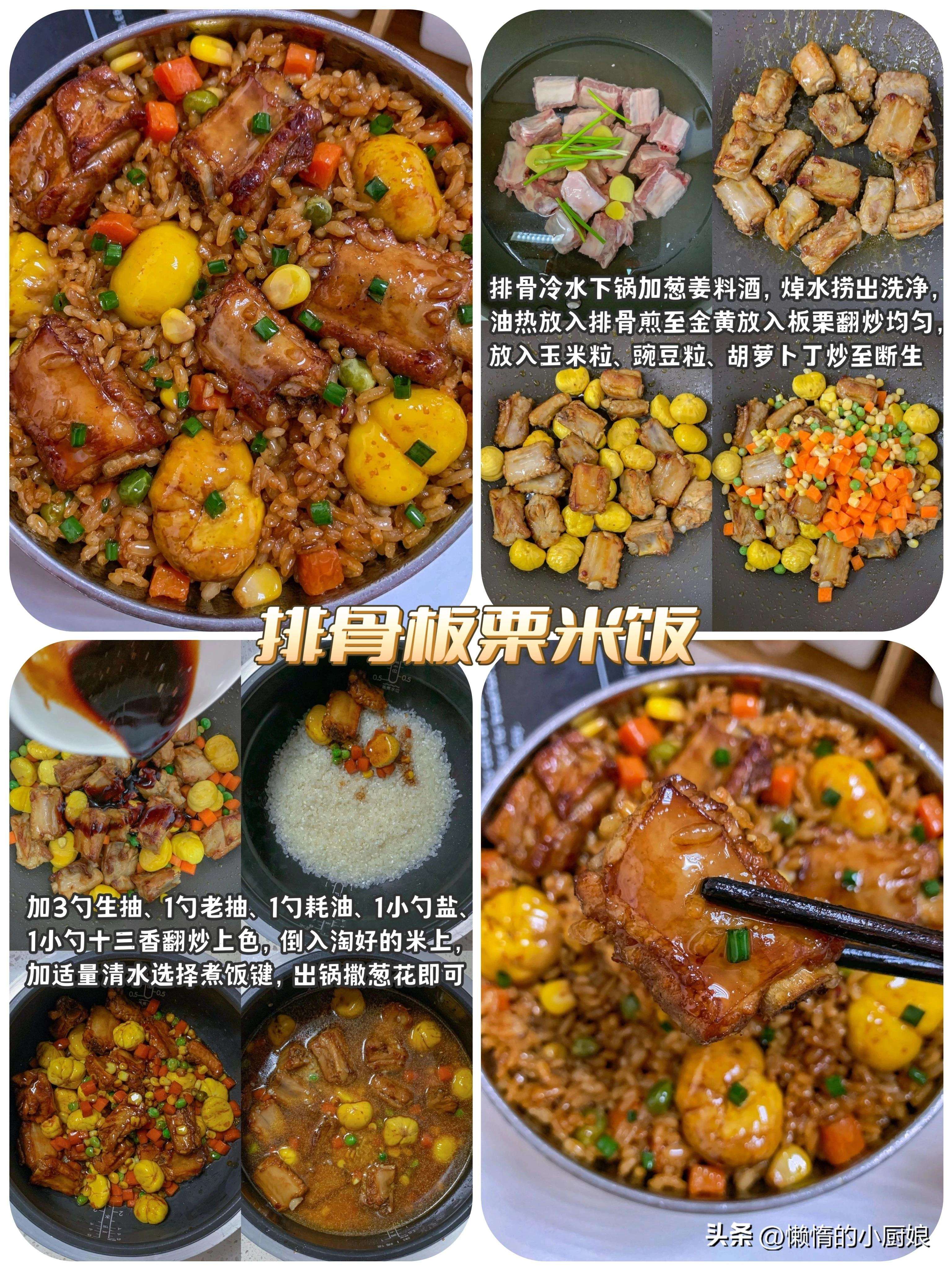 懒人饭排骨蔬菜焖饭做法如下食材准备排骨 300 500g 胡萝卜 70g 玉米 10g即食玉米更方便豌豆 10g 油 20g 生抽 11g 盐 3g 白糖 3g 老抽两勺料酒一勺花椒粉一撮蚝油若干 大米比平时少三分之一量排骨处理排骨洗净后,加入两勺老抽一勺料酒一撮花椒粉若干蚝油,用手。