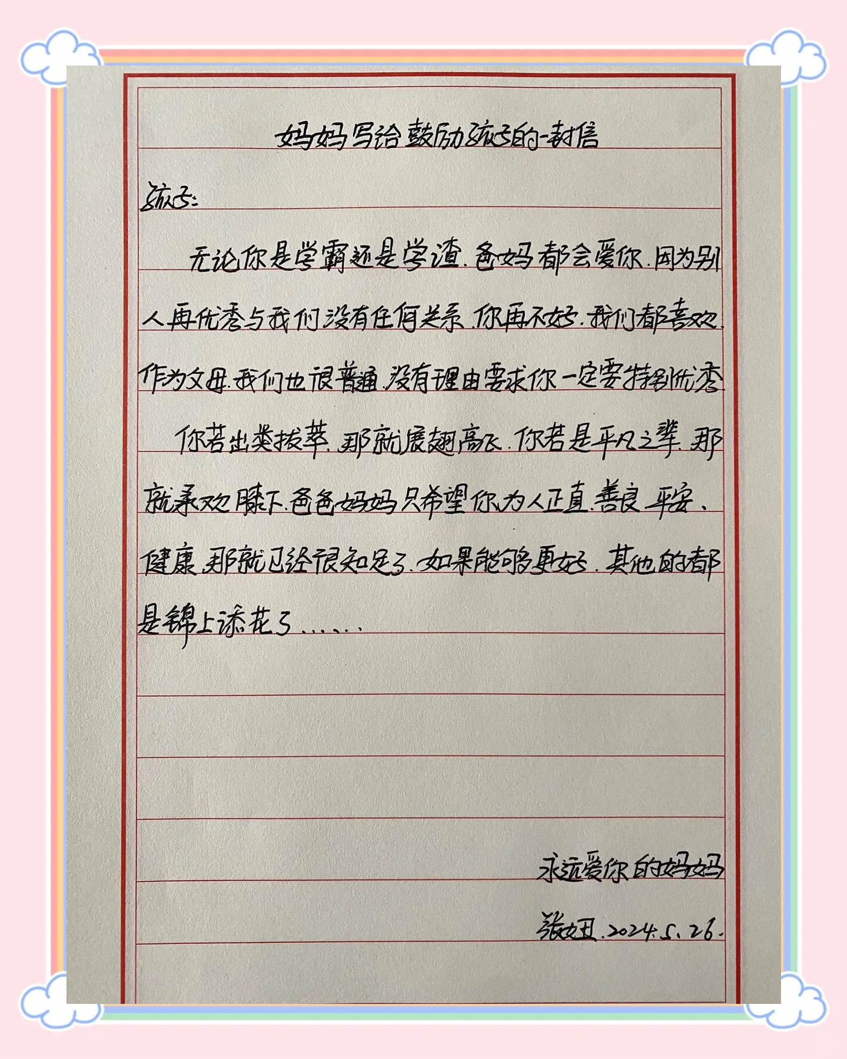 3、1相信这短暂的7天会影响并改变你今后的人生,妈妈期待你的改变,希望你今后会是一个内心充满自信勇敢坚强的男子汉孩子,你在妈妈的心中是最棒的加油喔2妈妈这次支持你参加夏令营,是希望你能体验一下独立生活的滋味,检验一下自己的能力,没有爸爸妈妈的陪伴,陌生的环境,虽然有很多困难。