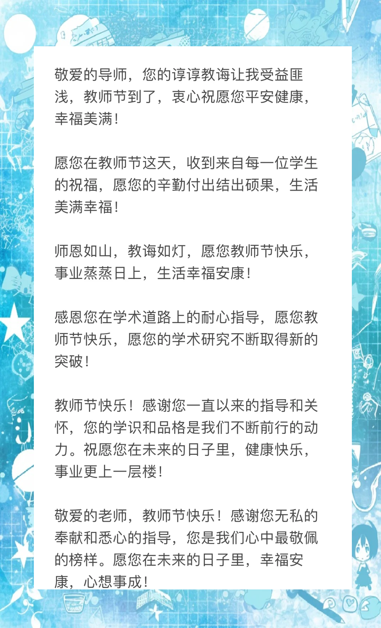 2、您的教诲如春风化雨,让我在知识的海洋中遨游您不仅是知识的传播者,更是我们心灵的导师感谢您用智慧和爱心,为我们铺就了成长的道路教师节来临之际,向您致以最诚挚的祝福愿您身体健康,工作顺利,桃李满天下老师,您用无私的奉献,点亮了我们的未来您的每一句话,每一个眼神,都深深地;教师节老师祝福语50字怎么写如下1愿天下所有的老师快乐随你一年中的每一天,平安伴你一天中的每一时,健康牵你一时中的每一分,幸福陪你一分中的每一秒祝您教师节快乐2亲爱的老师,你们将大好年华付与三尺讲台,手执三寸粉笔,在一面黑板上书写大千世界,教导莘莘学子,不为回报,只是;18无论我们身处何方,我们都无法忘怀恩师在我们成长道路上洒下汗水,付出的辛劳今天是教师节,让我们祝所有的教师节日快乐让我们对所有的教师说一声老师辛苦了19把记忆叠成小船,飘荡在思念的心上把思念寄托风铃,摇曳学校的回忆把回忆串成故事,写满真挚的祝福把祝福融入短信,老师;教师节温馨祝福语一真挚情感表达 我要用最温馨的爱,报答老师的传业之恩,愿老师的每一天都充满欢笑与满足,事事顺心愉快教师节,送上我最真诚的祝福,感谢您无私的奉献二回忆往昔致敬 曾经那间教室,承载着我们的欢声笑语曾经那棵树,见证了我们成长的足迹如今,站在讲台上的您,依旧。