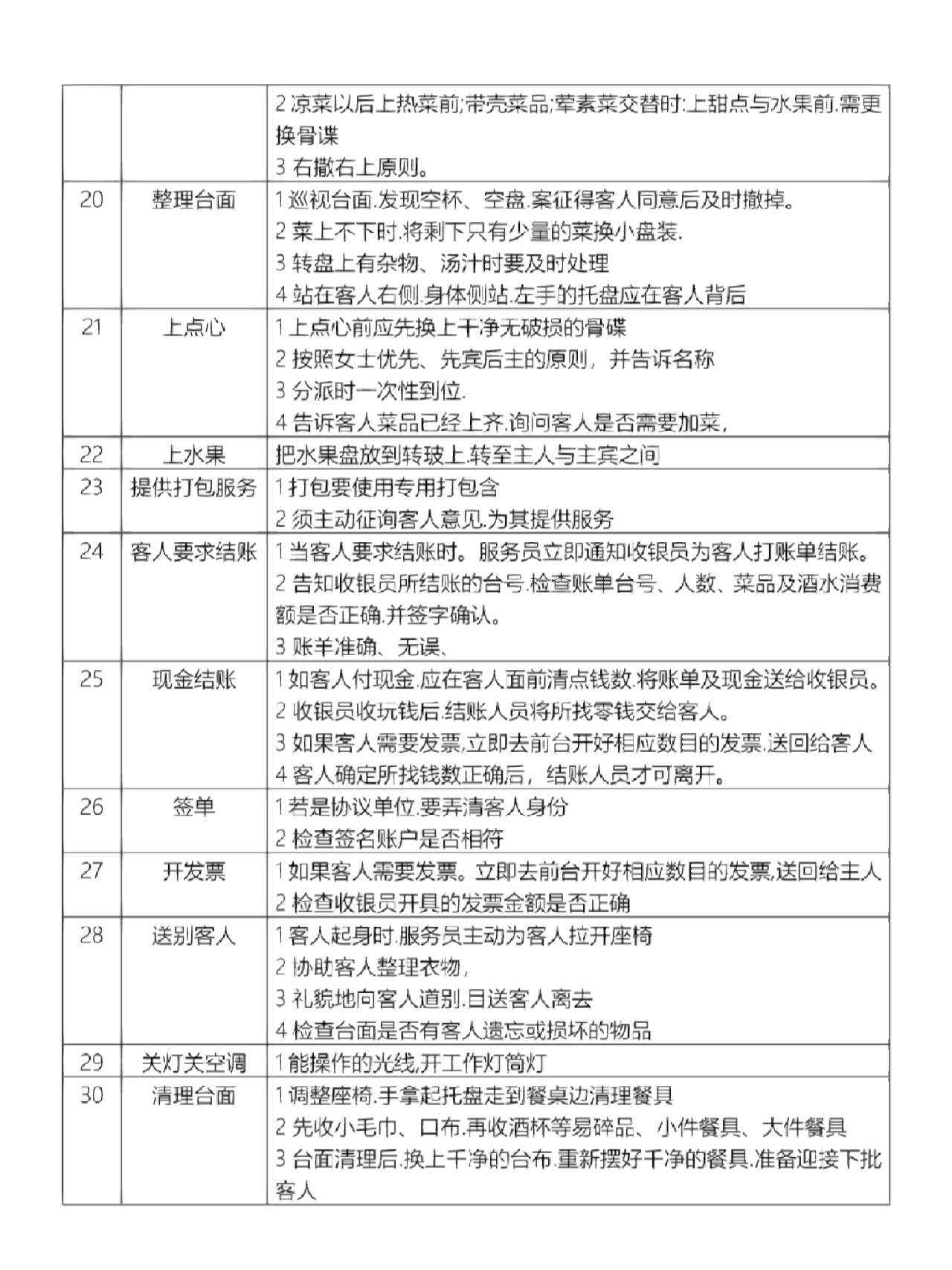 服务员有事暂时离开工作区域时,一定要向邻区的服务员打招呼寻求帮助不要长时间离岗,办事完毕应迅速返回工作区随时巡查地面和台面卫生,及时清理以保持清洁6结账顾客示意结账时,服务员应及时到吧台结算如遇顾客亲自到吧台结账,服务员应跟随,核对清单要准确无误问清付款人,报清所消费的。