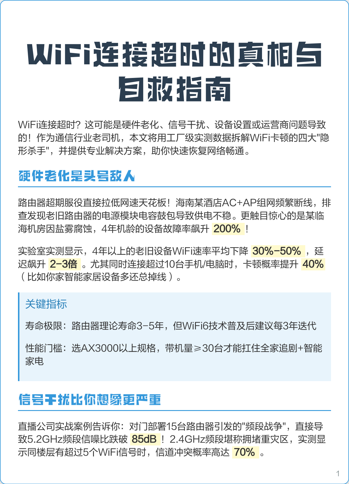 1、网络一直显示超时,可通过以下步骤系统性排查和解决一硬件层面检查与处理物理连接排查检查网线是否松动断裂或水晶头氧化可轻晃网线观察路由器指示灯是否闪烁,若接口氧化,用橡皮擦清洁金属触点若使用无线连接,需确认设备与路由器距离不超过10米且无金属遮挡2 设备性能评估路由器使用超过5年易;2如果其他设备连接这个WiFi也存在相同问题,初步判断可能是该 WiFi 网络存在问题,建议更换WiFi热点尝试三若无任何提示\提示网络接入满\提示已停用网络故障\提示连接超时 1电镀金属磁性等等保护壳自身材质具有一定的屏蔽抗干扰特性,会导致手机出现信号差或者不稳定的情况,建议您取下保护壳,看看;手机连接WiFi网络超时的可能原因及解决方法1首先检查无线路由器是否正常工作,可以使用其他手机或者数码产品连接该 WIFI 信号,如果都能正常连接和正常上网,那么一般来说这个路由器是可以正常工作的2手机开启了休眠状态关闭网络检查手机是否开启休眠状态下关闭网络的选项,手机过一段时间就会断开连接;1建议使用其他手机或设备连接WiFi试试能否上网,这点主要是排除WiFi本身问题2重启一下路由器试试,或者将路由器恢复一下出厂设置,然后重新拨号上网,并根据设置向导重新设置WiFi3联系一下宽带客服,确认宽带账号是否有异常4如果以上原因都不是,那很有可能是电脑的问题了,建议电脑恢复一下;网络服务提供商问题原因网络服务提供商的服务器或线路出现故障解决方法联系网络服务提供商,报告遇到的问题并寻求帮助综上所述,解决WiFi连接超时问题需要根据具体情况进行排查和处理通过逐一排查上述可能原因,并采取相应的解决方法,通常可以找到问题的根源并解决它。