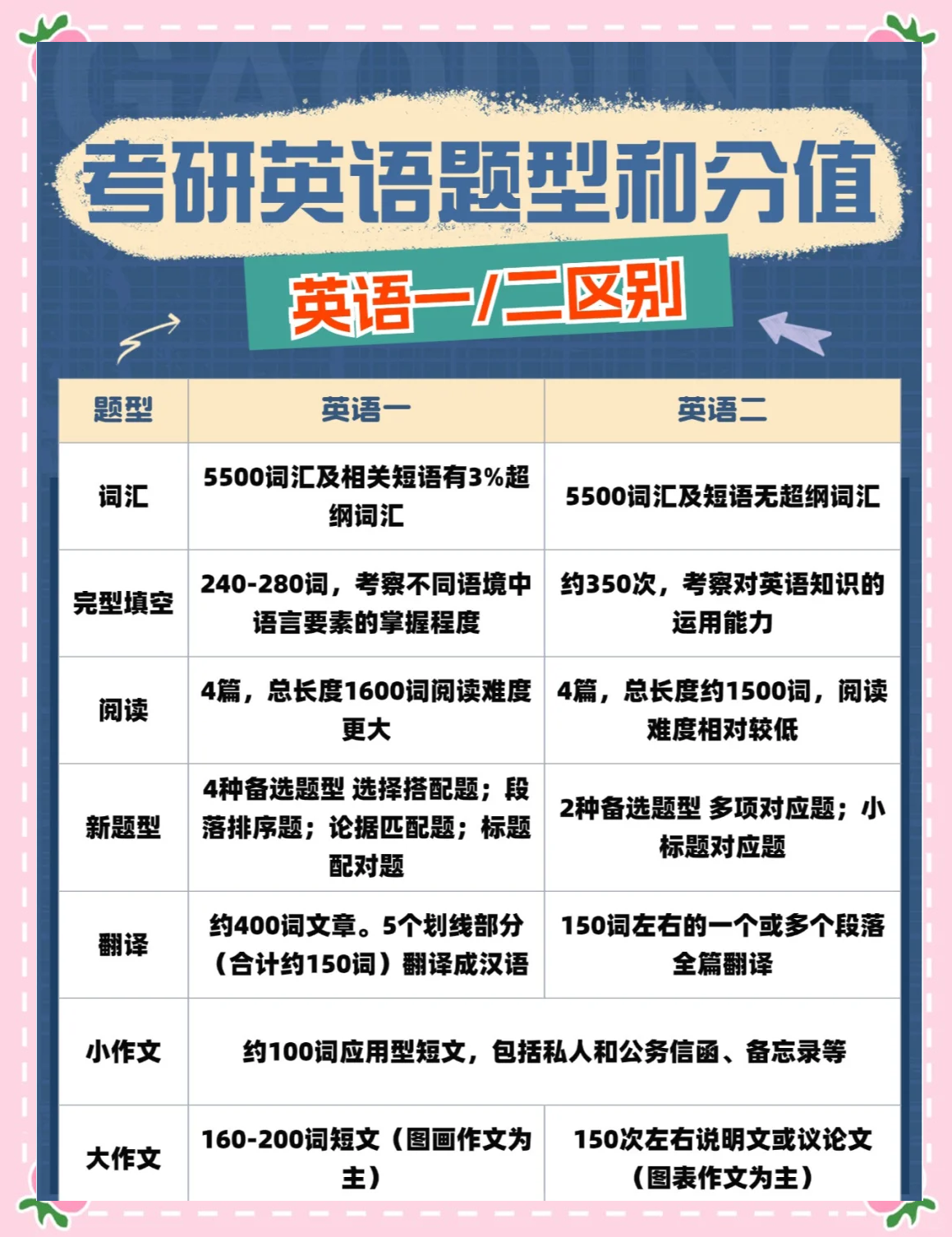 三试题难度不同 词汇量虽然两者的词汇量都在5500左右,但英语一会出现约百分之三的超纲单词,而英语二则不会出现超纲词汇此外,英语一和英语二在每个题型中的词汇量也不同,如完形填空英语一文章在240280词左右,而英语二则在350词左右语法英语二大纲规定了总共有八种语法点,而英语一。