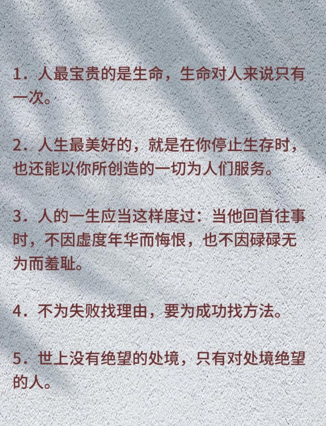 钢铁是怎样炼成的中,奥斯特洛夫斯基通过主人公保尔·柯察金的生活经历,传达出深刻的名言警句其中最著名的便是“人最宝贵的是生命,生命只有一次,因此,我们应以奋斗的姿态度过,不因虚度光阴而悔恨,不因碌碌无为而羞愧当回顾一生时,能自豪地说,我将我的全部生命和精力献给了人类解放的伟大。