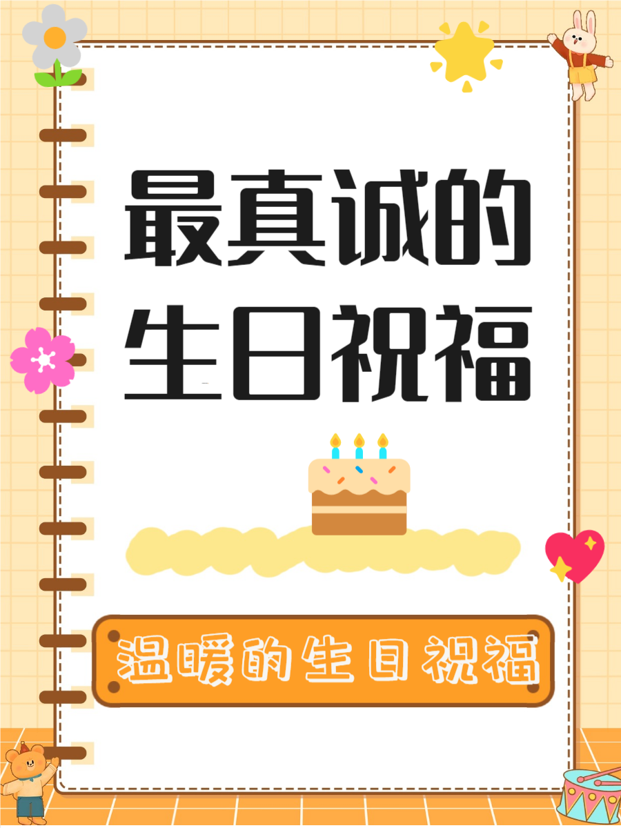4、以下是一些生日祝福语,供您参考 生日快乐,愿你天天开心,事事顺心,身体健康,事业有成! 愿你的生日充满无尽的快乐,愿你的梦想都能实现,愿你的一生幸福安康! 生日快乐,愿你永远保持乐观的心态,勇往直前,迎接未来的每一天! 在你的生日这一天,愿你收获满满的爱和幸福,愿你的生活充满阳光和希望! 愿你的生日充满;1愿祝福萦绕着你,在你永远与春天接壤的梦幻里,祝你心想事成幸福快乐!生日快乐! 2在这甜蜜的日子里,祝你生日快乐!愿你分分秒秒,都是欢乐时光愿你在新的一年里,天天开心,事事顺利! 3一句问候,一声祝福,一切如愿,一生幸福,一世平安,祝生日快乐! 4两片绿叶,饱含着它同根生的情谊一句生日祝福的话,浓缩了我对你的祝福愿快乐拥抱你,在这属于你;简单又大气的生日句子? 朋友生日又要到了,怎么样对朋友送祝福更大气呢?下面是我收藏的一些不错的生日祝福语 生日快乐!愿你的每一天都充满阳光和快乐 愿你的生日充满无尽的快乐,愿你的梦想都能实现 愿你的人生如星辰般璀璨,如阳光般温暖 愿你永远保持乐观和勇气,愿你的生活充满喜悦和幸福,愿你的未来比。