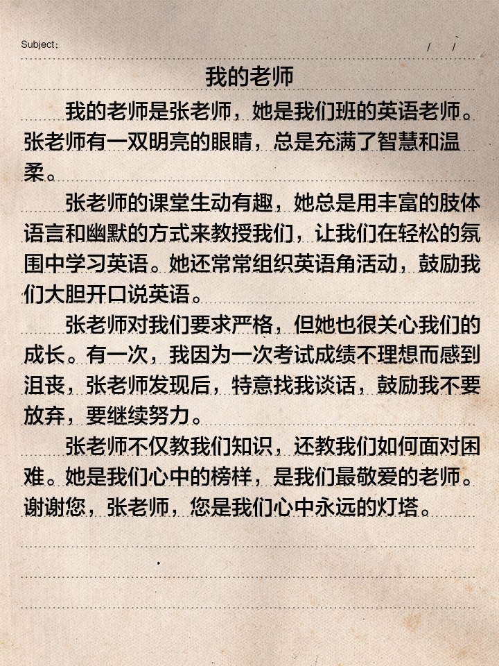 我的老师是一位和蔼可亲且略显严格的老师,他的教学方法如同外国教师般独到记得有一次,史老师正在开会,我却遇到了他,当时我还在做卫生史老师看到我,二话不说,将自己的报告递给我,说“大不了我被骂一次”我感激地接过报告,那声音仿佛是公元前200年屠夫砍腊肉时的嘶吼史老师不仅善于处。