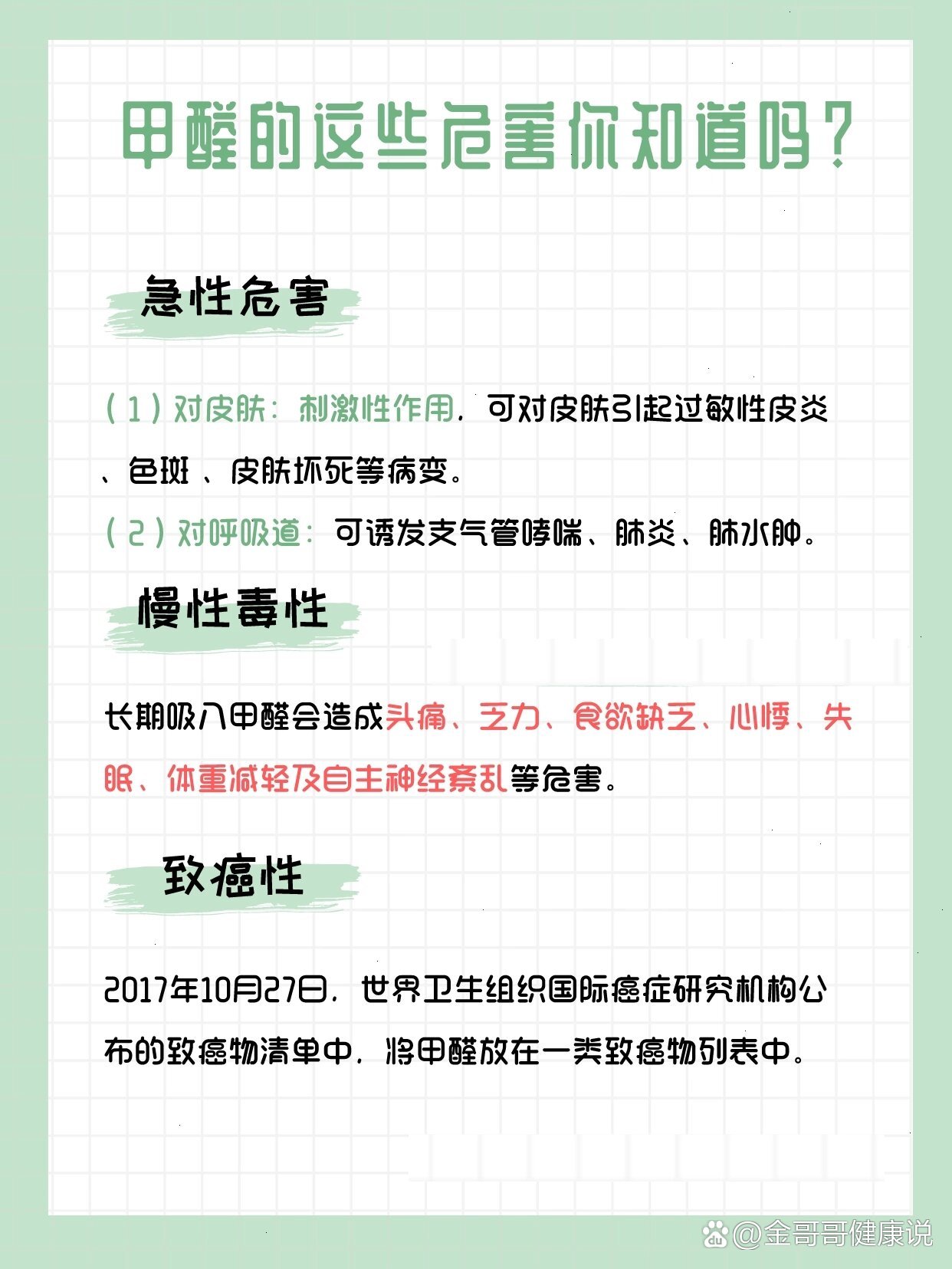 甲醛对人体的害处主要包括以下几点致癌作用甲醛已经被世界卫生组织认定为一类致癌物长期接触低剂量的甲醛可以引起鼻咽癌结肠癌脑瘤等癌症刺激作用主要表现为对皮肤黏膜的刺激高浓度吸入时可以出现呼吸道刺激和水肿头痛等症状致敏作用皮肤直接接触甲醛,可以导致过敏性皮炎色斑坏死。
