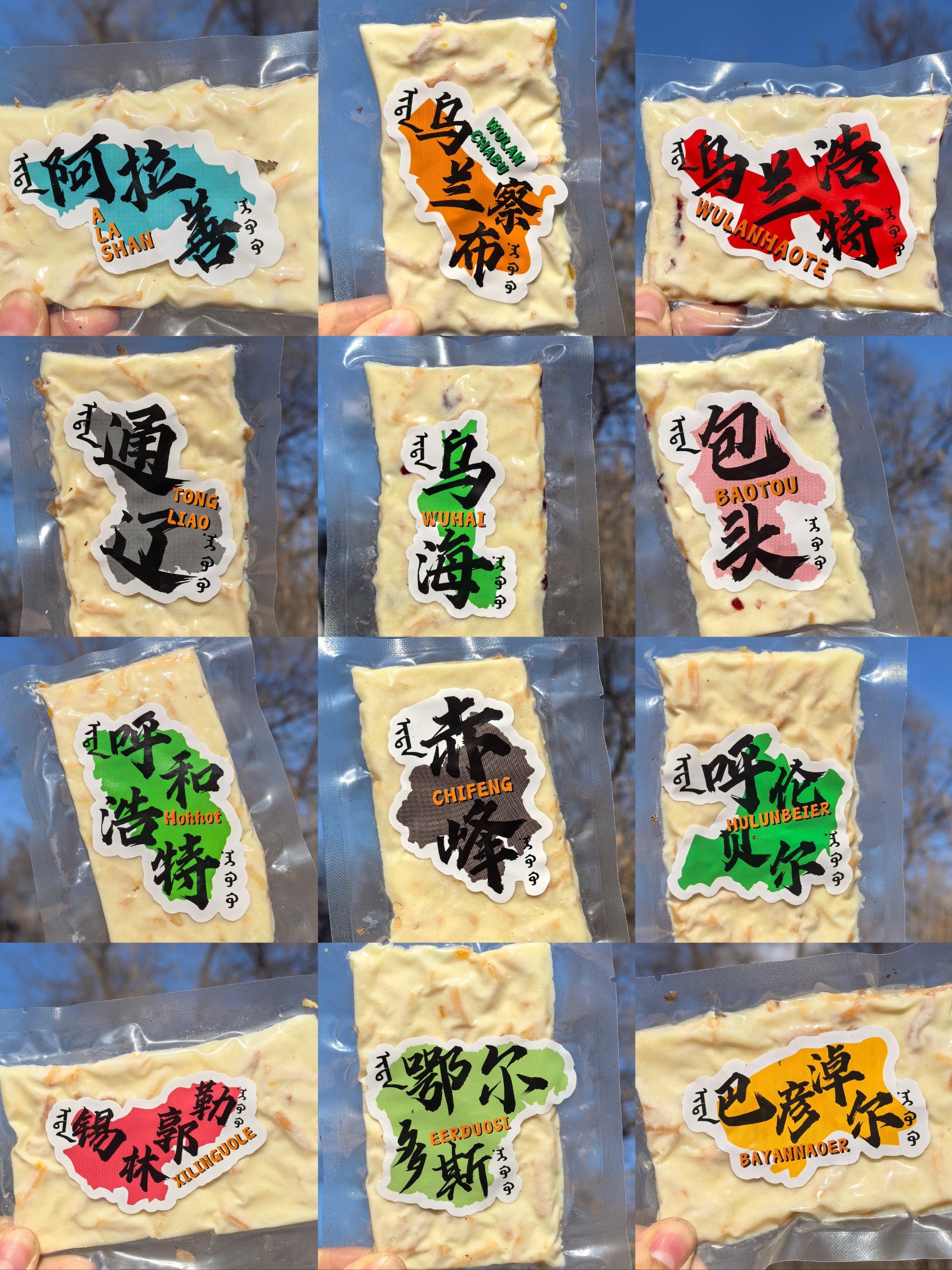 蒙古炸炸当地特色面食,以内蒙古河套地区出产的兆丰面粉和面,加入奶油切成细条后炸制而成,口感清脆,一碰就碎,可口香脆,作为零食携带食用非常方便内蒙奶豆腐基本呈方块状,有酸奶味和原味两种,都十分美味既可以当作零食直接吃,也可以泡在奶茶里食用,一物两吃,是携带方便又美味的特产内蒙。