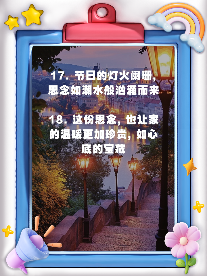 “每逢佳节倍思亲”完整诗句 独在异乡为异客,每逢佳节倍思亲遥知兄弟登高处,遍插茱萸少一人译文一个人独自在他乡作客,每逢节日加倍思念远方的亲人遥想兄弟们今日登高望远时,头上插满茱萸只少我一人注释1九月九日即重阳节古以九为阳数,故曰重阳2忆想念3山东王维。
