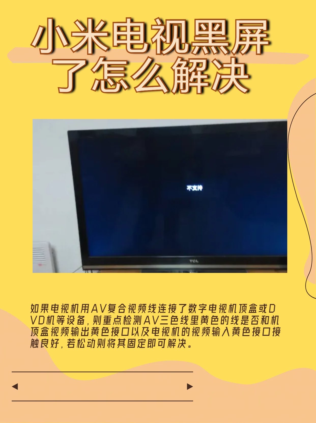 4机顶盒没有开启,导致电视没有图像和声音输出解决方法把机顶盒开启即可5电视机屏的背光板坏了或其他特殊情况6电视内部的屏驱动电路有虚焊造成的故障7电视机里的AD板上控制高压板开关部分电路被烧坏了解决方法以上第57点需要让专业的师傅拆机检测维修,如果电视还在保修期,送至。