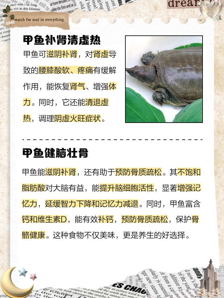 在甲鱼的饲养过程中,需要确保生长环境的宁静,给予它们足够的独处时间,尽量避免打扰它们1 甲鱼在夜间倾向于躲在河的北岸,这里不仅避风向阳,而且石头较少它们避免泥沙多的地方,因为泥沙容易粘在身上,妨碍活动野生甲鱼通常喜欢生活在水草丰富的区域2 甲鱼大部分时间生活在水中,水质的好坏显著;4 与龟类不同,野生甲鱼的外壳并非由骨板构成,也没有明显的纹理,这使得它们的保护性相对较弱5 甲鱼以水生动物为食,幼年时期主要以蝌蚪和小虾为食,成年后则可以食用田螺通过以上对野生甲鱼藏身喜好的描述,读者可以对甲鱼的生活习性有更深入的认识,并希望这些信息能提供实际帮助;野生甲鱼的生活习性主要包括以下几点喜好环境野生甲鱼偏好清洁的水域,特别是活水沙质或淤泥水底安静且背风向阳的地方它们对惊扰寒冷和大风非常敏感摄食习性作为变温动物,甲鱼的摄食量与水温密切相关水温在2032°C时,食量较大低于20°C时,食量下降低于15°C则不进食夏季高温时。