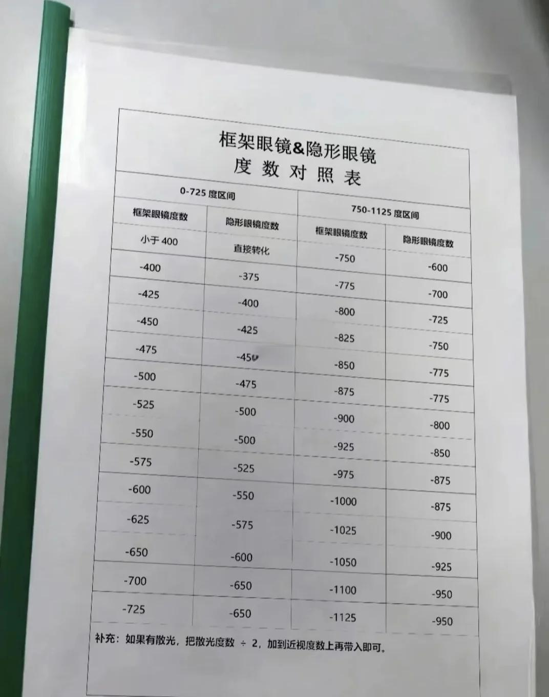 例如,框架眼镜度数为400度时,隐形眼镜应换算为375度,因为框架眼镜400度和隐形的382度是等效的,而隐形眼镜中通常没有382度这一选项,所以取最接近的375度换算表仅供参考二散光度数处理 50度散光 普通隐形眼镜没有散光矫正功能,但50度散光与25度近视在视觉效果上是。