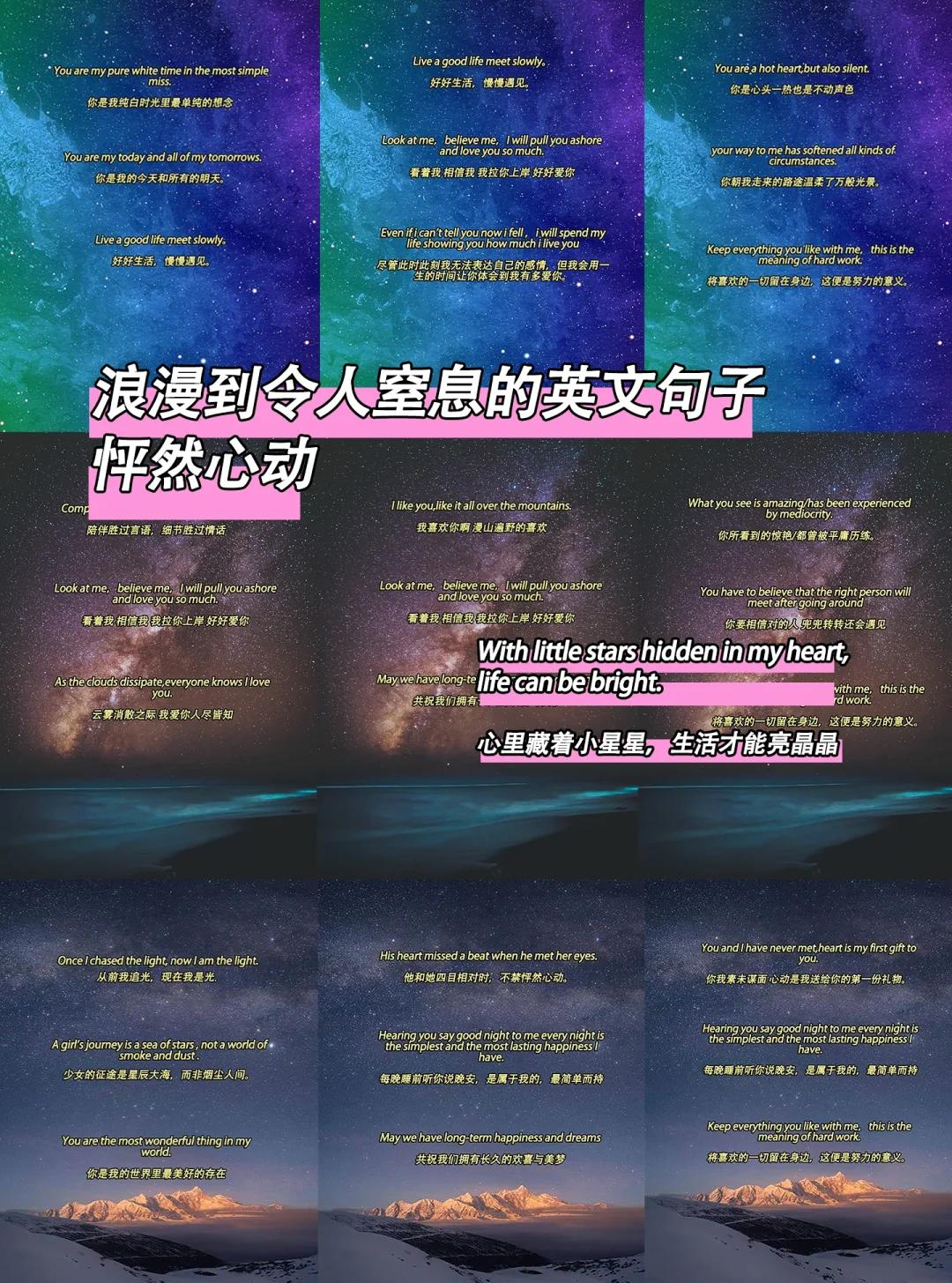 15好的爱情是你通过一个人看到整个世界,坏的爱情是你为了一个人舍弃世界 15Good love makes you see the whole world from one person while bad love makes you abandon the whole world for one person 16在自己面前,应 7 唯美英文句子 1Sometimes you need to look back, otherwise you wil。