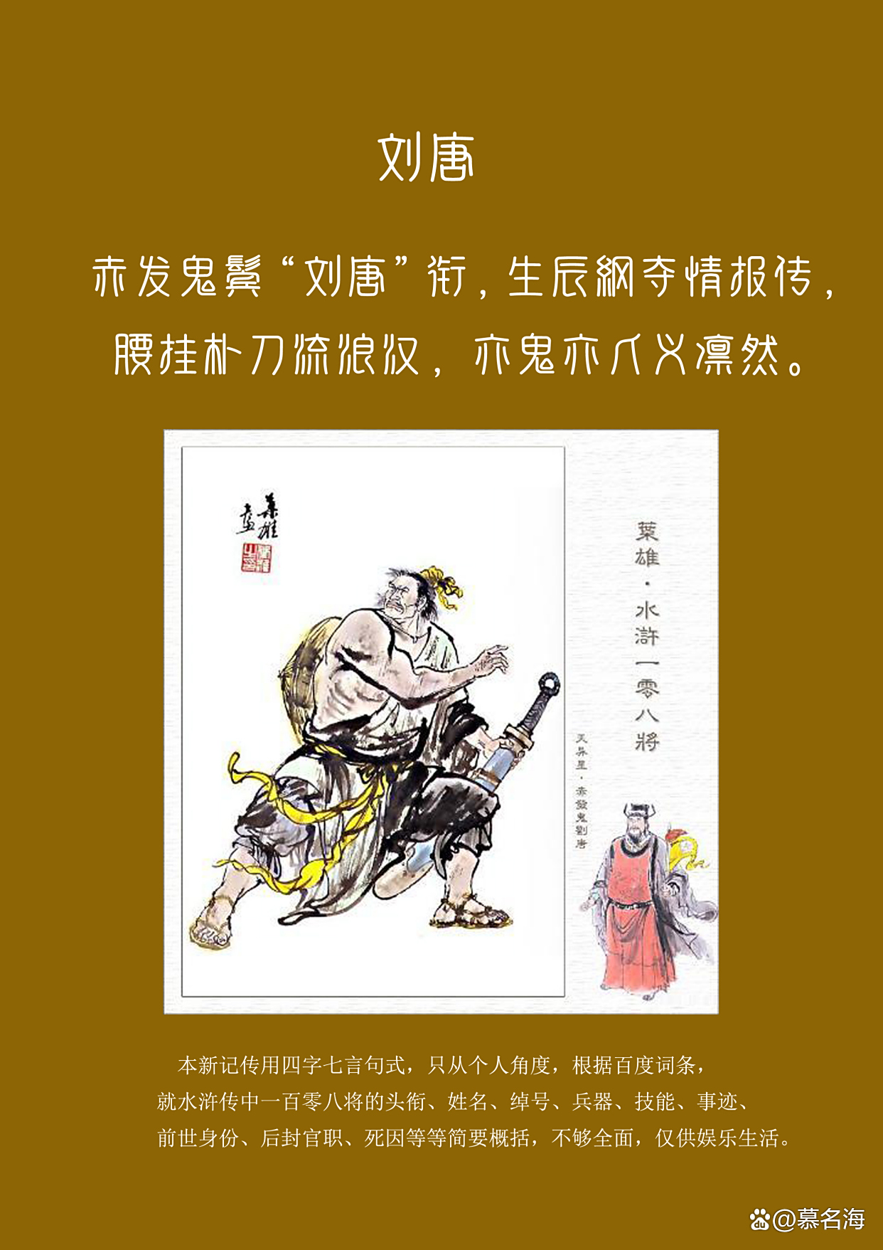 除了ldquo赤发鬼rdquo这一绰号外,早期水浒故事中的刘唐还有一个绰号在南宋龚圣与所著宋江三十六人赞中,刘唐的排名变成了第六位,绰号也变成了ldquo尺八腿rdquo那么,ldquo尺八腿rdquo是什么意思呢该书中的一段赞辞揭晓了答案该赞辞称ldquo将军下短,贵称侯王,汝岂非;刘唐,绰号赤发鬼,东潞州人氏他与晁盖吴用等七人结义,一同劫取生辰纲,后上梁山入伙,是晁盖的心腹班底梁山大聚义时,排第二十一位,上应天异星,担任步军头领征方腊时战死于杭州,追封忠武郎2托塔天王晁盖 晁盖~1119,梁山泊的第二任寨主,山东郓城县东溪村人,东溪村保正,本;综上所述,刘唐的“赤发鬼”绰号既体现了他的外貌特征,也反映了他的性格特点,使得这一角色在水浒传中更加鲜明生动;天异星,绰号赤发鬼,梁山英雄第二十一名,排步军头领第三位,使朴刀与托塔天王晁盖等人合谋劫生辰纲后,上了梁山征方腊时,在攻打杭州的战斗中阵亡刘唐有赤砂紫脸的相貌,其步下武艺凶狠诡谲,还带着浓厚的江湖世俗气息由于刘唐不善马战,大哥晁盖死后从事的工作也不太起眼,所以大众的印象分不。