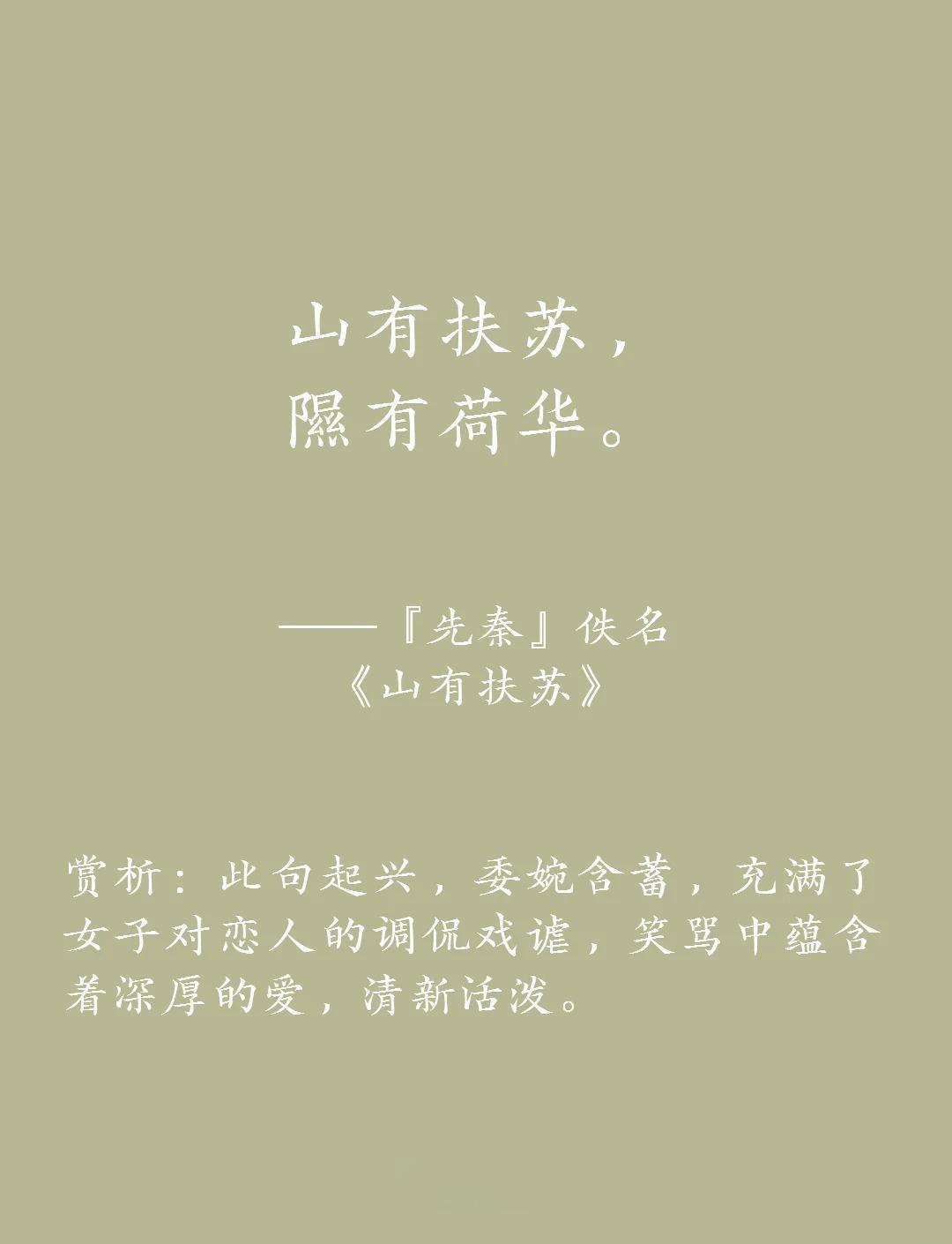 这是出自于诗经里的国风·郑风·山有扶苏,是先秦时代郑国华夏族民歌,这句话的意思是山上有茂盛的扶苏,池里有美艳的荷花其中扶苏树木名一说桑树隰xí洼地低洼的湿地荷华是指荷花,华huā同“花”全文内容是山有扶苏,隰有荷华不见子都,乃见狂且山有。