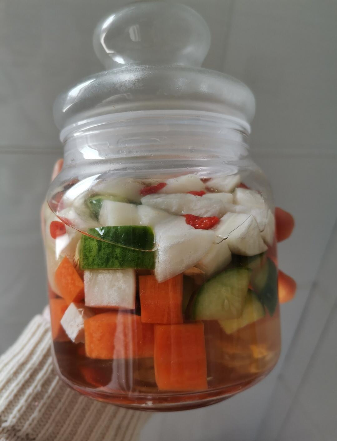 制作方法1白萝卜清洗干净,切成大块2泡菜坛子清洗干净,不能有水分,放进生姜小米辣萝卜块3放入一个八角4倒入2瓶白醋5加入适量食用盐6倒入少量凉白开水将所有食材淹没7盖上泡菜坛子盖,在坛口加水密封,防止空气进入8等待24小时后,即可取出食用。