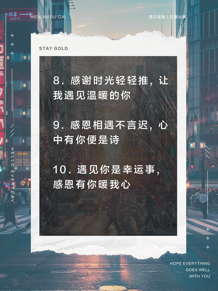 以下是一些关于“感恩遇见”的暖心文案感谢相遇感谢生命中的每一次相遇,更感谢命运中赋予的每一次重逢,愿时光不老,我们不散珍视相识相遇简单,相识总是不易,因此我尊重每一份来之不易的相识,感谢命运赐予的每一段重逢,即使短暂,也为我的世界带来了别样的温暖无悔遇见任何关心走到最后;感谢相遇的唯美句子最暖心短句1淡绿色的春天的蝴蝶,艳金色的夏天的昆虫,明黄色的秋天的归雁,和洁白的冬天的独角兽,它们都能记得,我是这样的想念你2错过,是为了下一次更好的相遇,如果相遇,我会更懂得如;9一路走来,感谢有你相伴无论是山重水复疑无路的绝望,还是柳暗花明又一村的欣喜10烂漫的玫瑰花给你绽放,挚热的暖心情话给你述说,真心实意的誓言给你许过,漫漫长路的人生道路与你相随,我爱你到永远,一生一世绝不分11曾经有那么多的相遇,仅有那么几次会永远留在我们心中并且;以下是一些有缘相遇的暖心句子1 世间所有的相遇,都是久别重逢,能在最美的季节里与你相遇,是我此生最幸福的事2 有缘千里来相会,无缘对面不相逢,感谢命运让我们相遇,从此我的人生多了一份温暖3 在茫茫人海中,我们的相遇如同星光交汇,璀璨而美丽,让人倍感珍惜相遇,是一种美丽的缘分在我们漫长的人生旅途中,会遇到许许多多的人;1 或许,我们的时空交错,所以也只是在一瞬间相遇,之后再无交集以下是本站整理的关于感谢相遇的唯美句子最暖心短句,大家来看看吧2 感谢我不早不晚能遇见你,与你相遇是我最大的幸运谢谢你出现在我的生命中,让我的生活充满阳光温暖3 茫茫人海,感谢相遇4 别辜负了相遇毕竟上帝一番;感谢相遇的唯美句子 看着街上忙碌的行人,一瞬间我仿佛看到了我们的缘分,感谢生命中的这次相遇,期待未来更多的美好时光 我们的相遇,如同春风拂面,温暖而美好,感谢这份难得的缘分 在这茫茫人海中,能够遇见你,是我最大的幸运,感谢相遇,珍惜彼此表达珍惜之情的暖心短句 每一次的相遇都是。