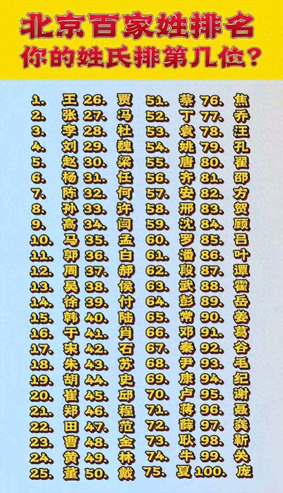 12、原收集姓氏411个,后增补到568个,其中单姓444个,复姓124个王,李,张,刘,陈,杨,黄,吴,赵,周,徐,孙,马,朱,胡,林,郭,何,高,罗,郑,梁,谢,宋,唐,许,邓,冯,韩,曹,曾,彭,萧,蔡,潘,田,董,袁,于,余,叶,蒋,杜,苏,魏,程,吕,丁,沈,任。
