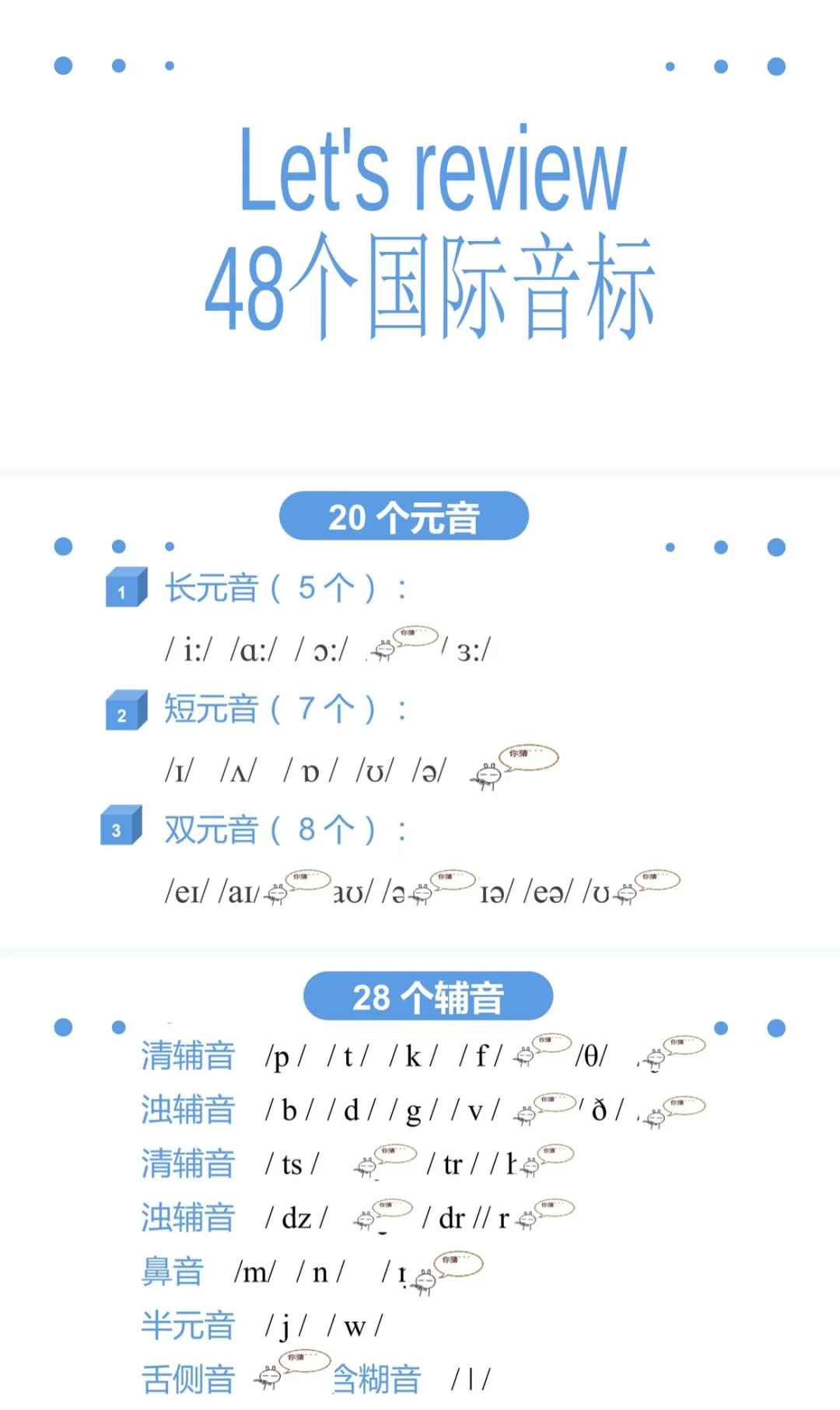 2、巧记48个国际音标单元音共十二,四二六前中后双元音也好背,合口集中八个整辅音共计二十八,八对一清又七浊, 四个连对也包括有气无声清辅音, 有声无气浊辅音,发音特点应掌握 01111 发布于20120805 举报 评论2 103 29 字母读音字母读音 大写 小写 大写 小写 A a ei N n;关于48个国际音标的正确读法如下英语国际音标总共四十八个,元音单双二十整,辅音清浊二十八按发音特点归类的28个辅音一舌音二半音三鼻音,六爆破六破擦十摩擦音元音部分单元音iiuuɑe,双元音ei;辅音28个音标的读法如下清辅音 p双唇紧闭,然后突然分开,气流冲出口腔,发出爆破音,但声带不振动 t舌尖抵住上齿龈,然后突然下降,气流冲出口腔,发出爆破音,但声带不振动 k舌后部隆起,紧贴软颚,然后突然下降,气流冲出口腔,发出爆破音,但声带不振动 f上齿轻轻接触。