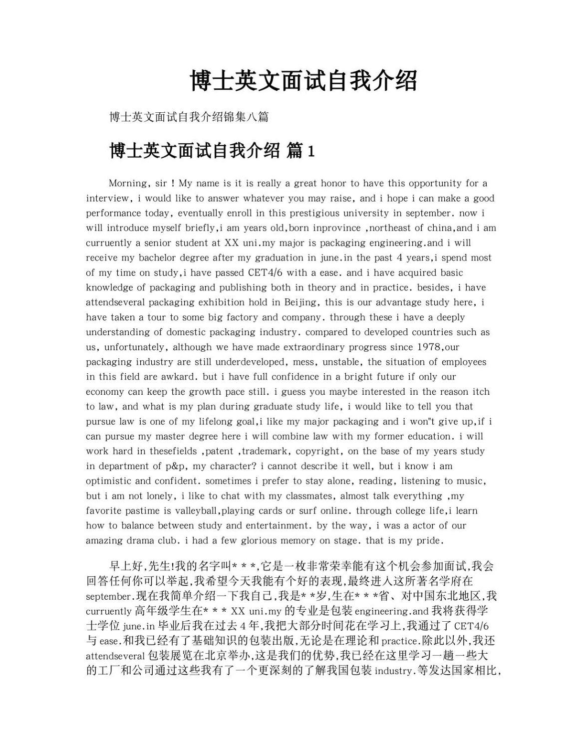 no gains, success belongs to the persevering”, I hope I can learn more from you, Thank you;计算机专业面试英文自我介绍1 My name is zhao wanjun wanjun is my given name wan means sweet and jun means person, so my name means a sweettempered girl i actually am! but you can call me june, for your convenience, june, IT#39s similar to my chinese name jun;Respected ProfessorsGood afternoon! I#39m great honored to meet you hereNow allow me to give a brief selfintroductionI#39m , 26 years old , born in city , HeNan ProvinceIn year 1996, I entered University, majoring in Machincal Designing and Producing During those 4 years#39;面试肯定少不了自我介绍,下面我整理了2017有工作经验的人英语面试自我介绍范文,欢迎阅读参考!2017有工作经验的人英语面试自我介绍一 Hello,My name is kalinda I graduate from xxx colleage My major is Ecommerce One part of my courses are Java, JSP, SQL and other about operation for。