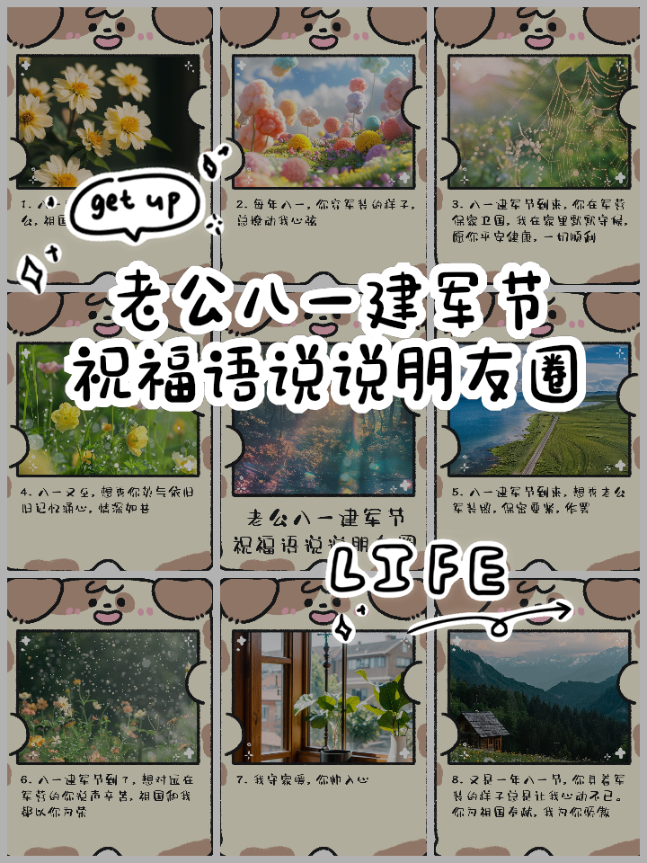 9、以下是几种不同风格的八一建军节朋友圈句子文艺风 青春有许多模样,他们偏偏选择了穿上军装的样子那笔挺的军装,是他们对家国最深情的告白那坚定的步伐,踏出了守护山河的决心万里山河,有他们皆安八一建军节,感恩每一位用忠诚守护岁月静好的军人,是他们让我们的生活充满阳光#致敬中国军人。