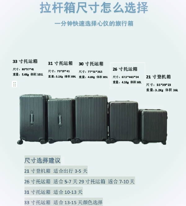 行李箱尺寸对照表 我因为工作的原因,需要经常出差赶飞机,所以对于各种行李箱比较了解之前因为我的行李箱的尺寸不符合标准而不能登机好几次,所以索性把各个型号都屯上了行李箱的尺寸有16寸18寸20寸22寸24寸26寸28寸和32寸 行李箱尺寸对照表为13寸拉杆箱尺寸28cm*40cm*13cm 可登机16寸。