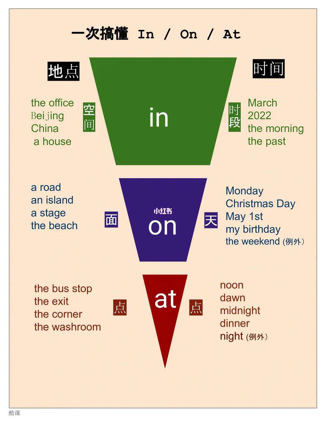 在英语中,介词inonat是极为常见且用法多样的词汇,它们都可以用于表示时间和地点,但具体使用时有着明显的区别以下是对这三个介词在不同情境下的详细解析一表示时间时的用法in 用法in表示的时间范围通常较广,常用于表示世纪年代年月周等较长的时间段例句Don worked in Bos。