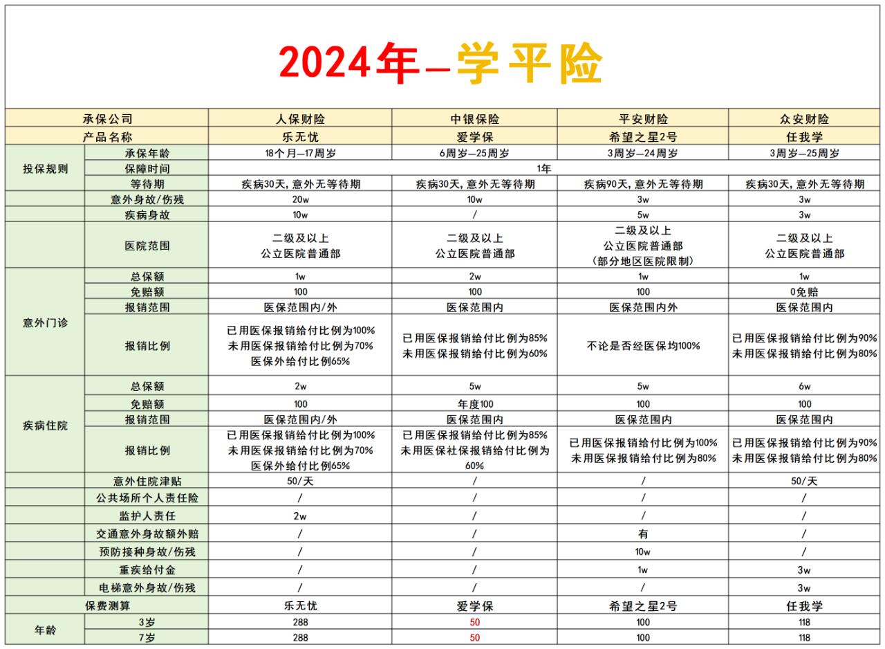 中国人寿100元学平险的报销范围主要包括意外门急诊医疗费用身故保险金以及住院医疗费用保险金以下是具体的报销范围及购买学平险的注意事项一报销范围 意外门急诊医疗费用保险金最高可报销6万元,每次有100元的免赔额,报销范围限制在社保范围内身故保险金被保险人在保障期间,无论因意外还是。
